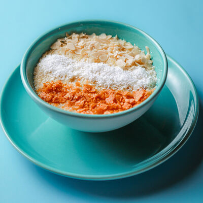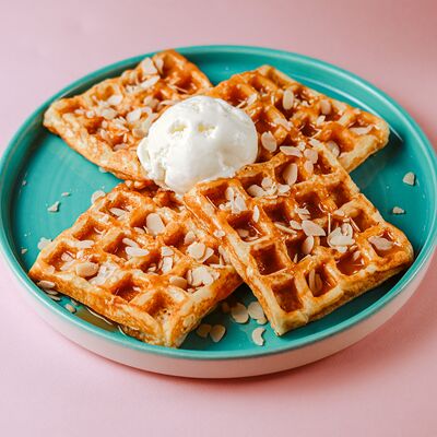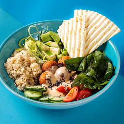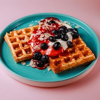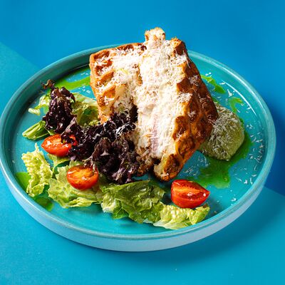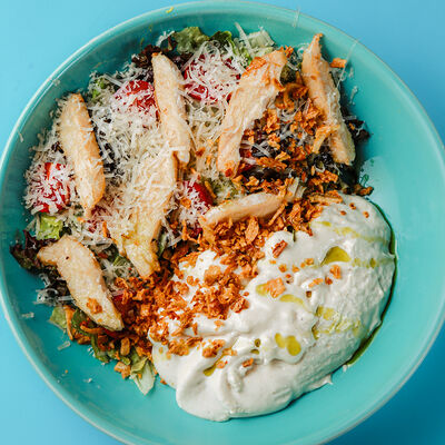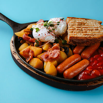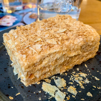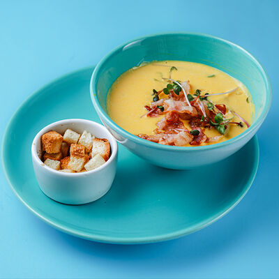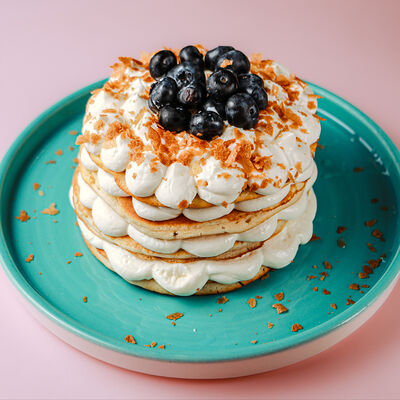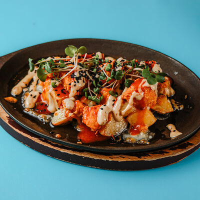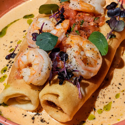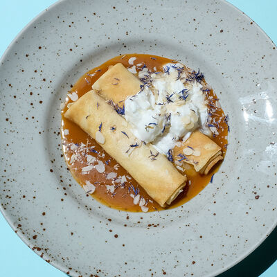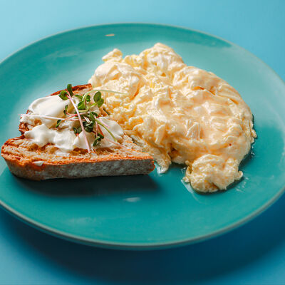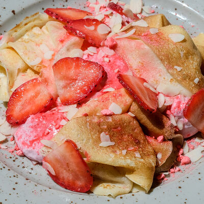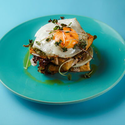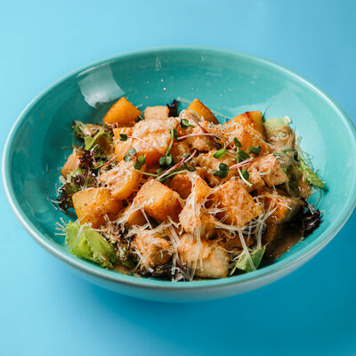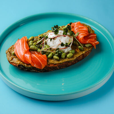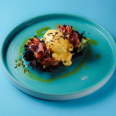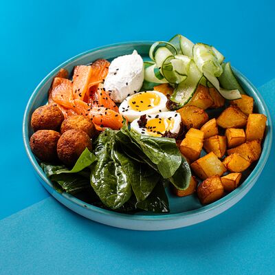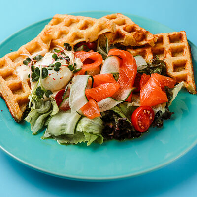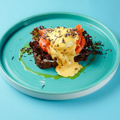 Блины (молоко, яйца, мука, соль, сахар), микс салата, лосось слабосоленый, яйцо пашот, сливочно-горчичный соус, зелёное масло