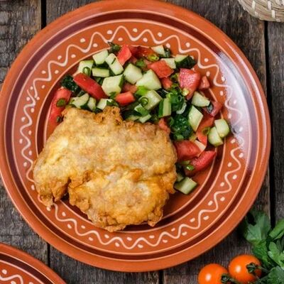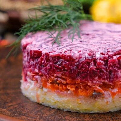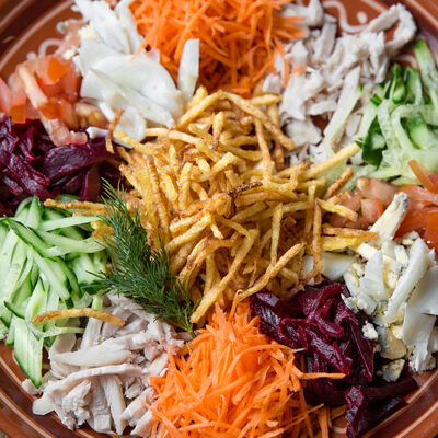 Из томатов, огурцов, свеклы, моркови по-корейски и курицы, с хрустящим картофелем пай. Заправляется майонезом