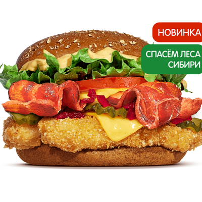 Это острая версия любимого Чикенбургера — со жгучим соусом вместо кетчупа! Фирменный куриный бургер с нежными наггетсами под острым томатным соусом, салатом Айсберг и майонезом на подрумяненной булочке с кунжутом.