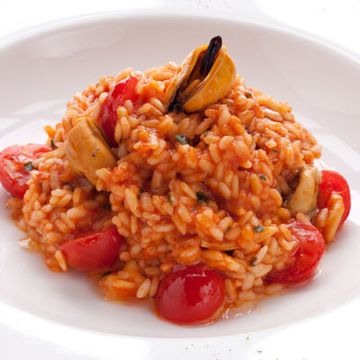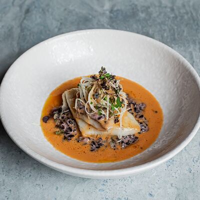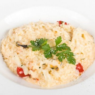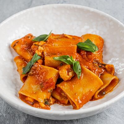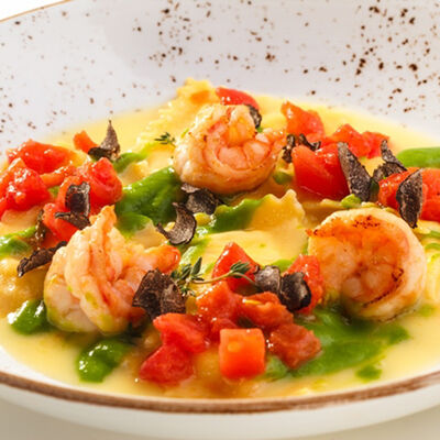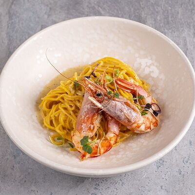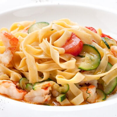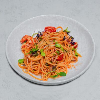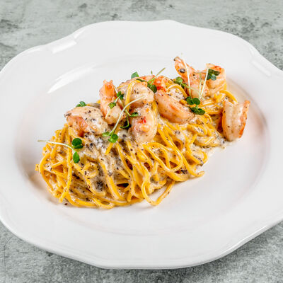 Паста, сливочный соус, кальмары, креветки, специи
