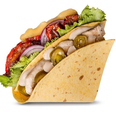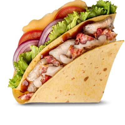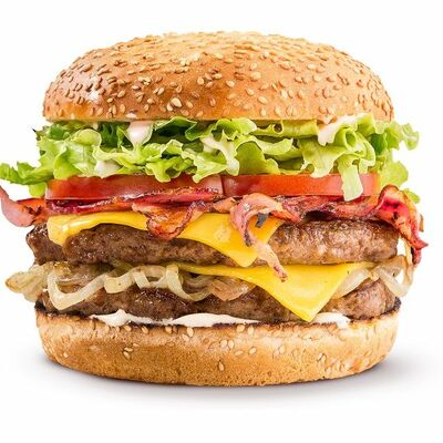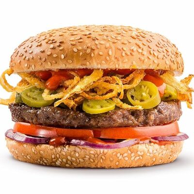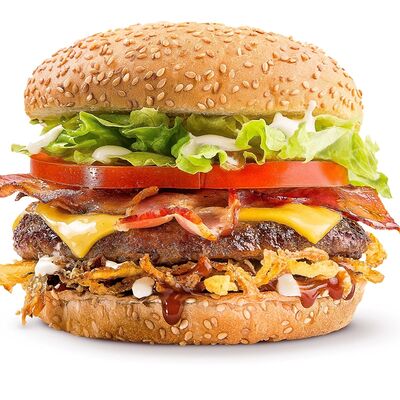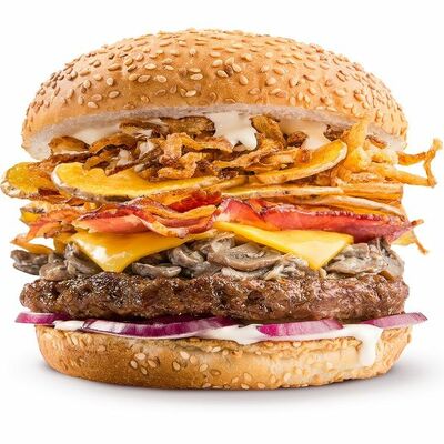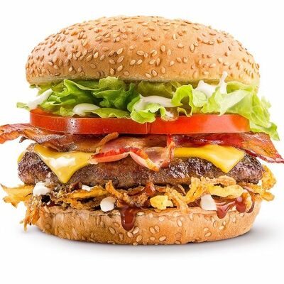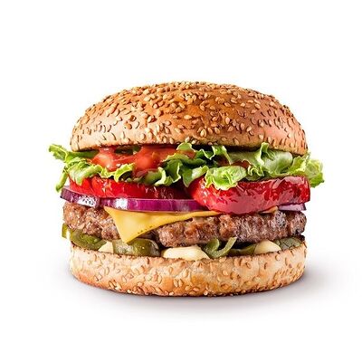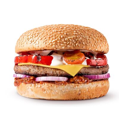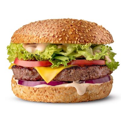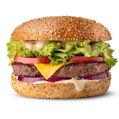Говяжья котлета или куриное филе, сыр чеддер, сладкий красный лук, томаты, салат айсберг, соус спайси