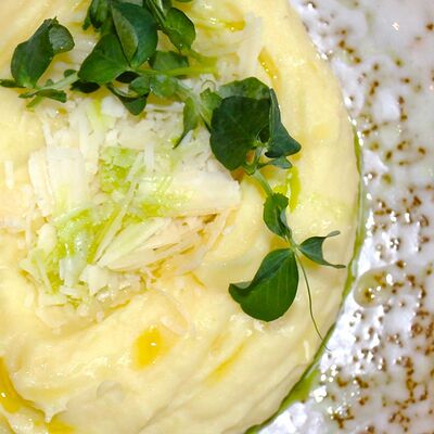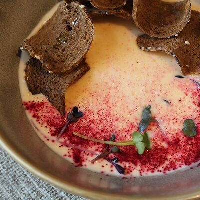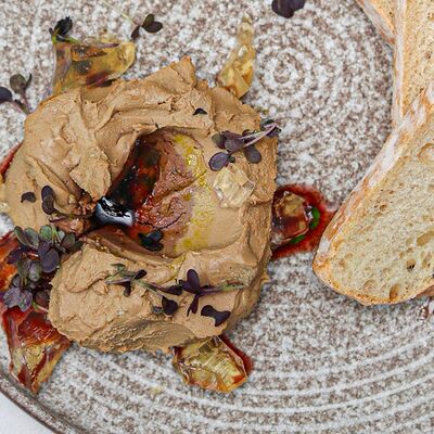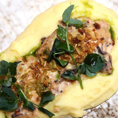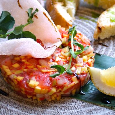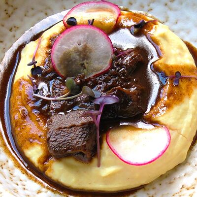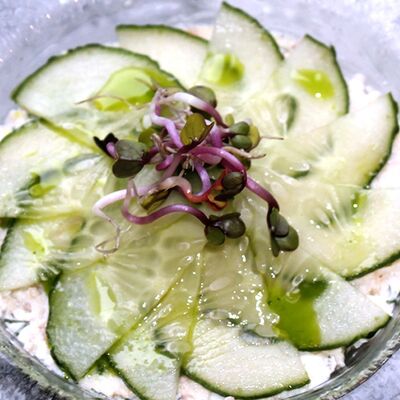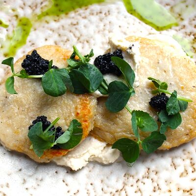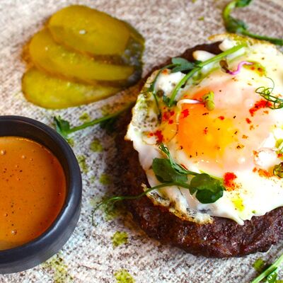 Мраморная говядина, яйцо, маринованные корнишоны, сливочно-перечный соус, масло (подсолнечное, сливочное и зеленое)