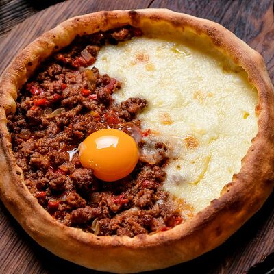 Лепешка круглой формы с нежным сыром сулугуни, который находится и внутри и снаружи