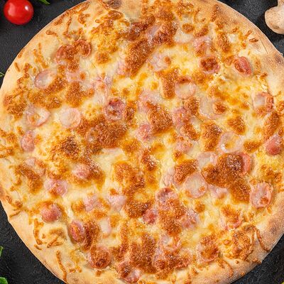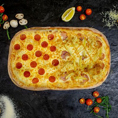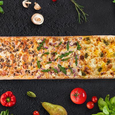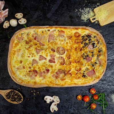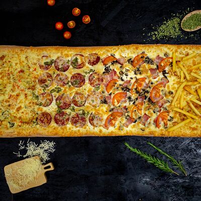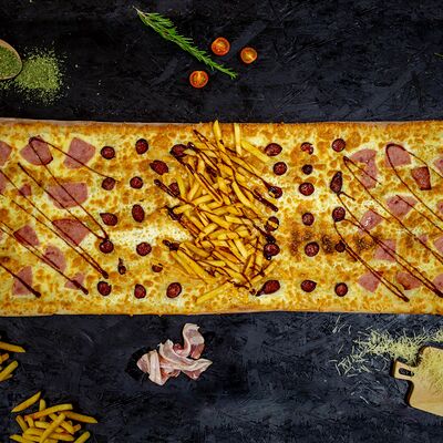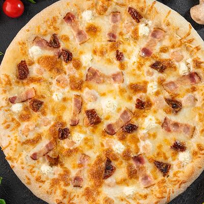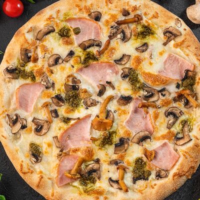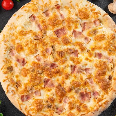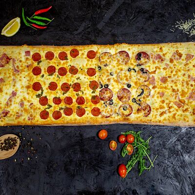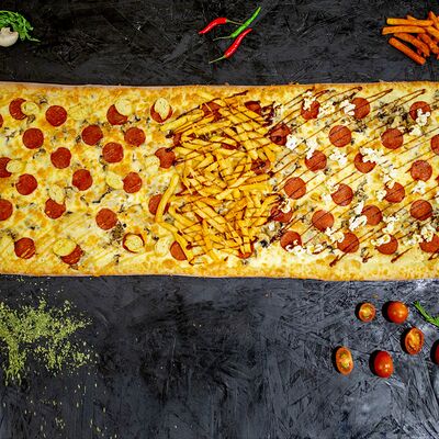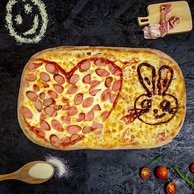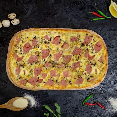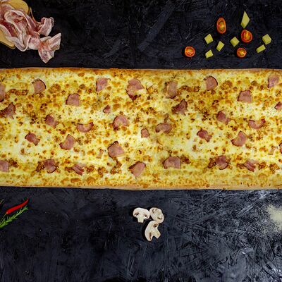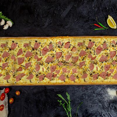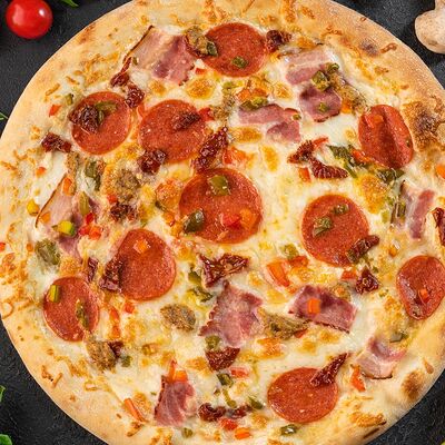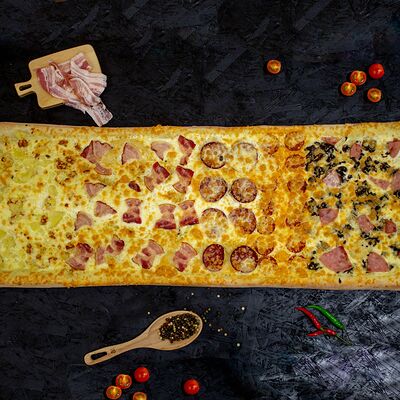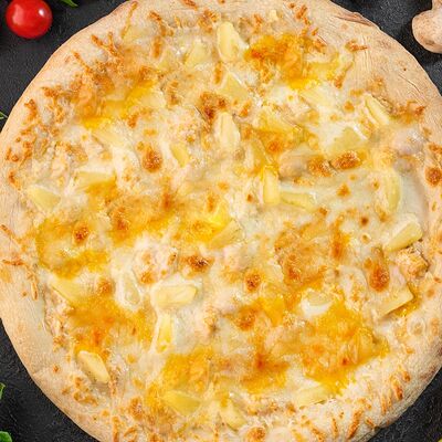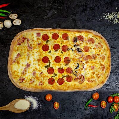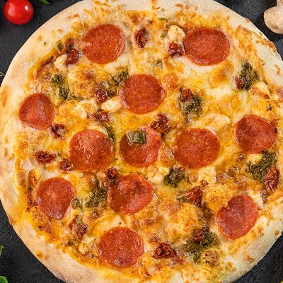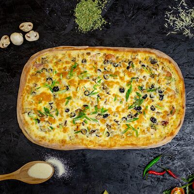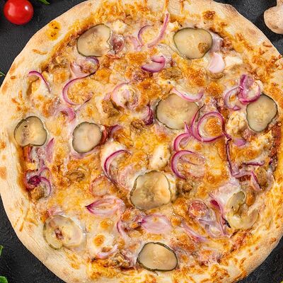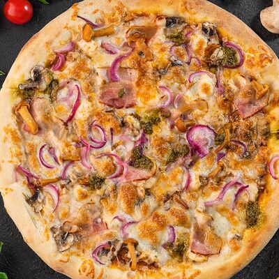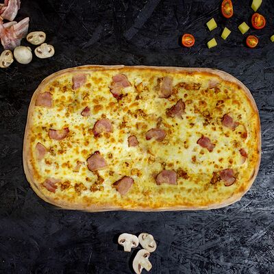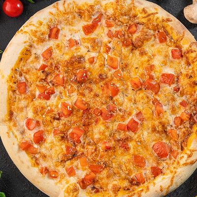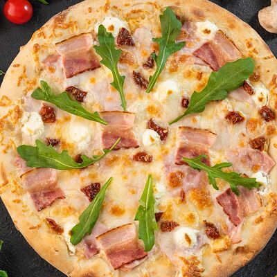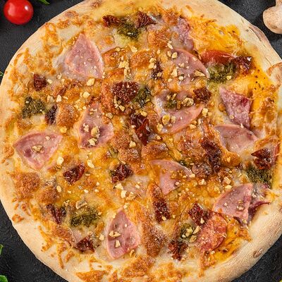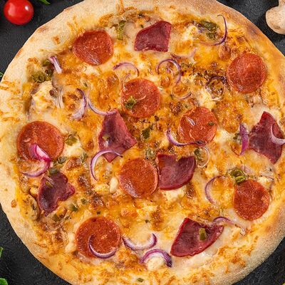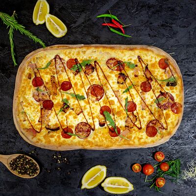 Тесто, курица, свинина, соус ранч, моцарелла, балык говяжий, помидор, руккола, соус гриль, арахис
