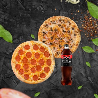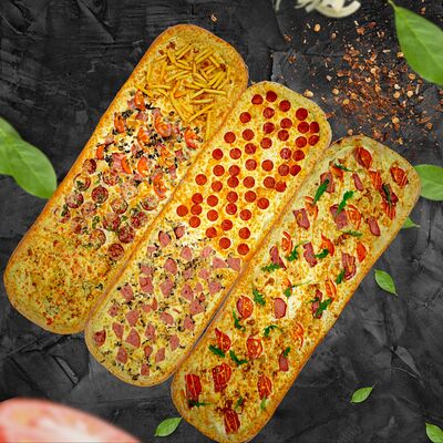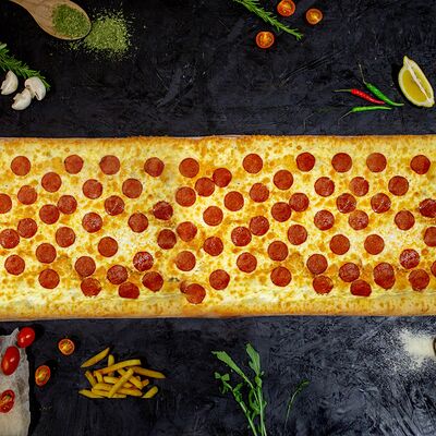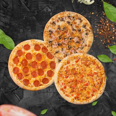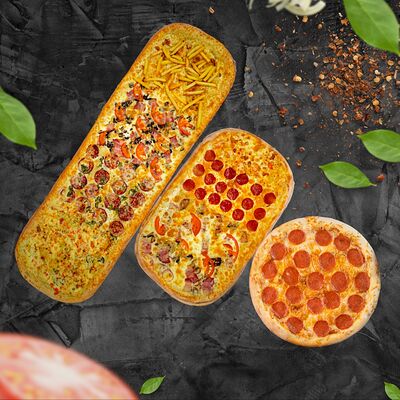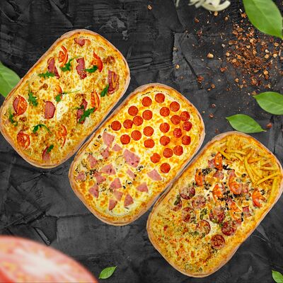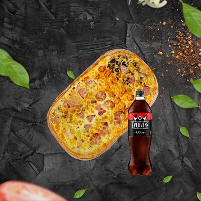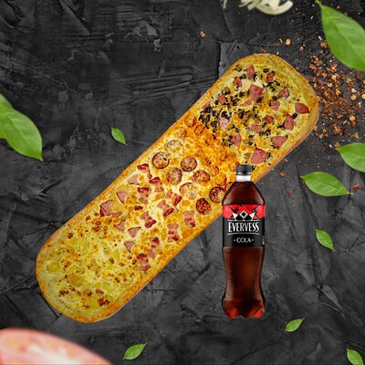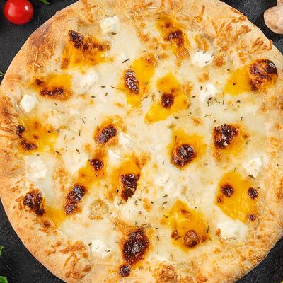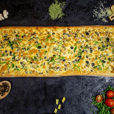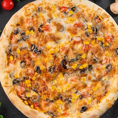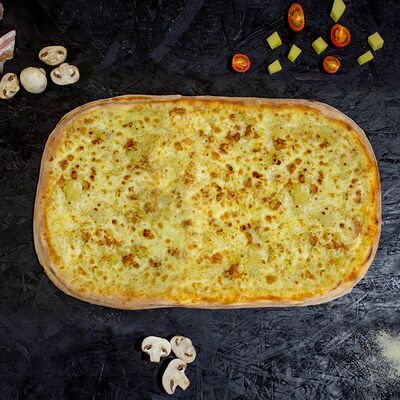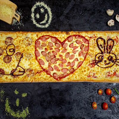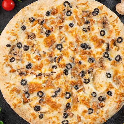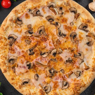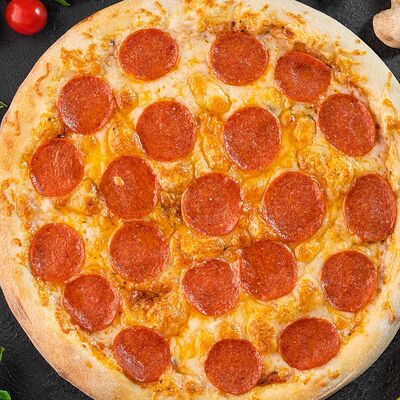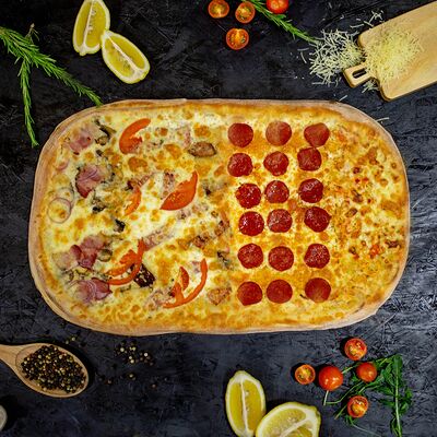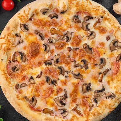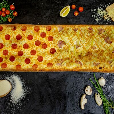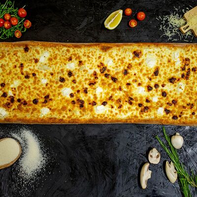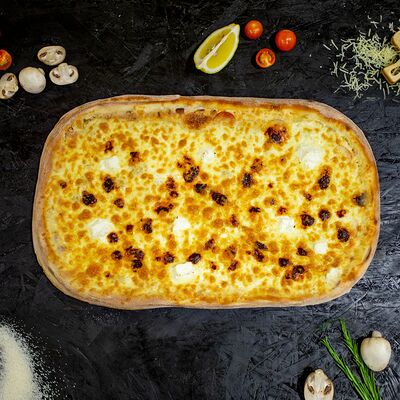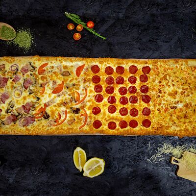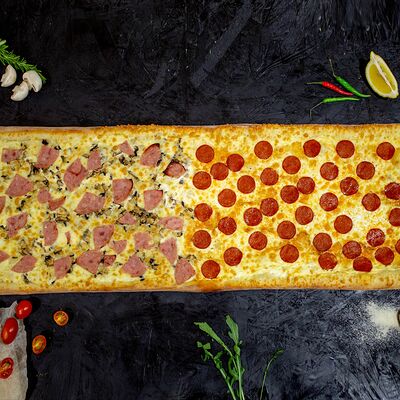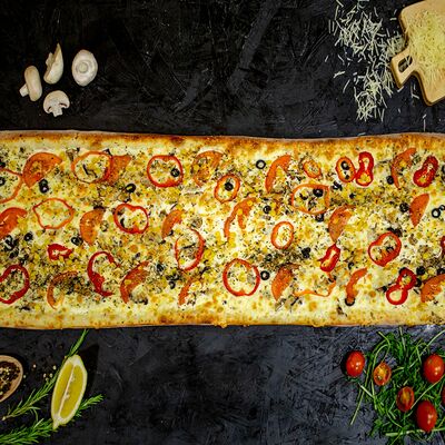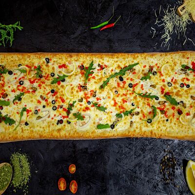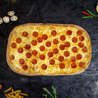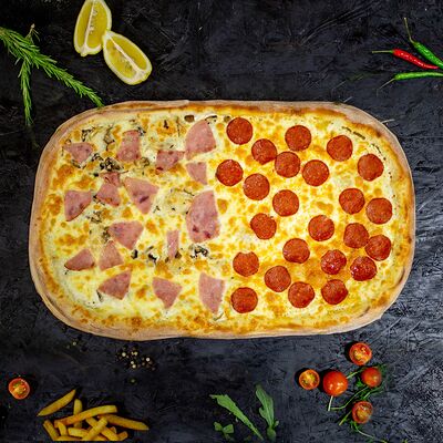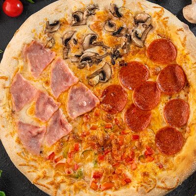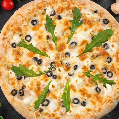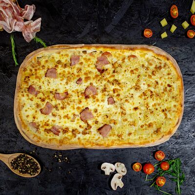 Тесто, курица, свинина, соус ранч, моцарелла, балык говяжий, помидор, руккола, соус гриль, арахис