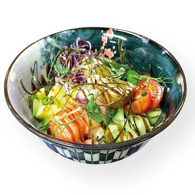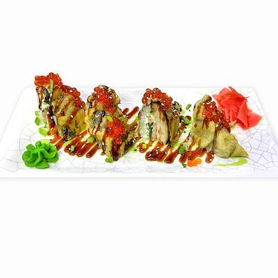 Рис, сливочный сыр, огурец, лосось, соус васаби, соус унаги, икра имитация, имбирь