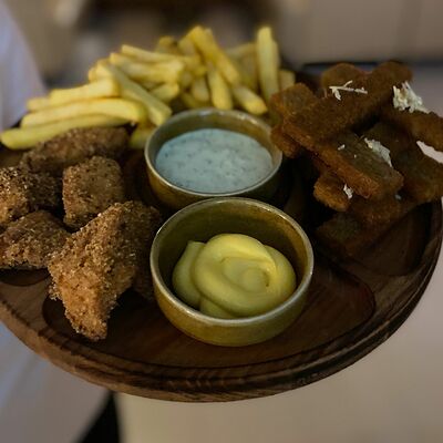Куриные крылья, картофель фри, луковые кольца, сыр во фритюре, соусы томатный и сырный