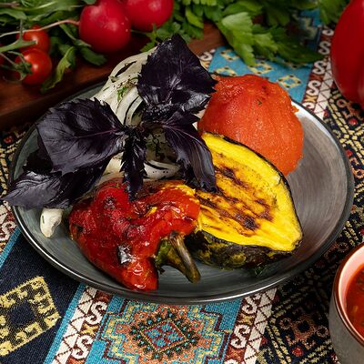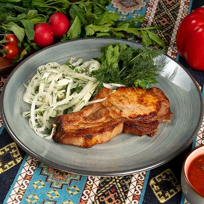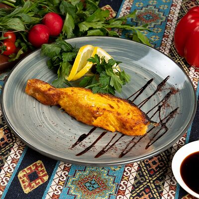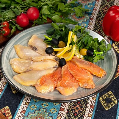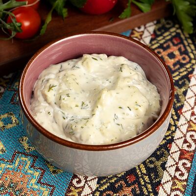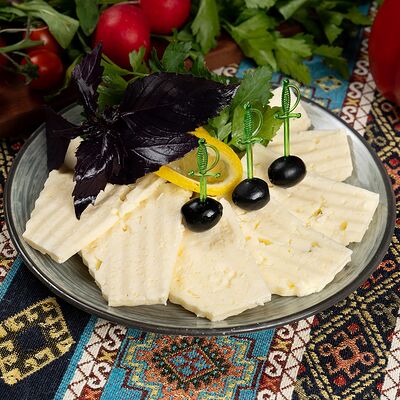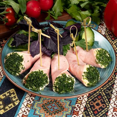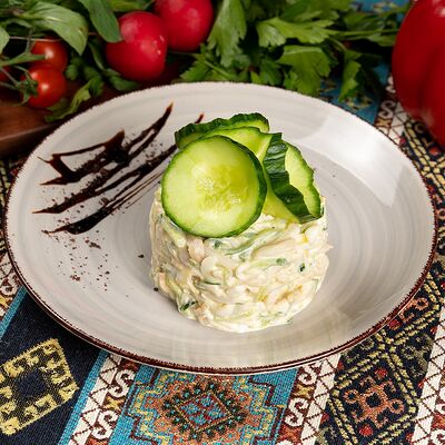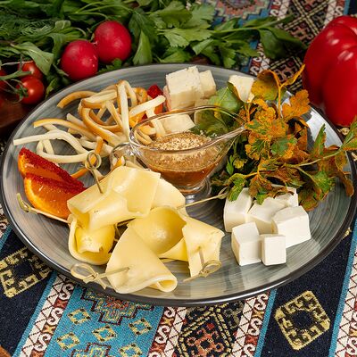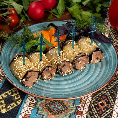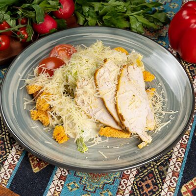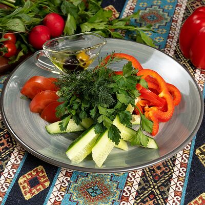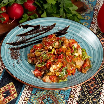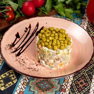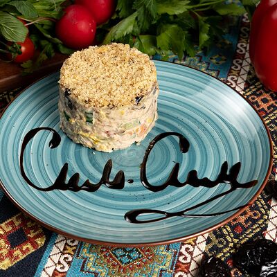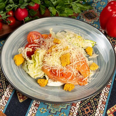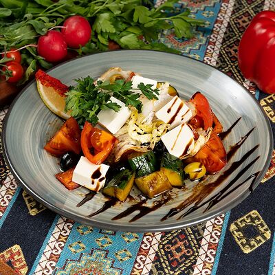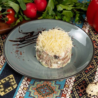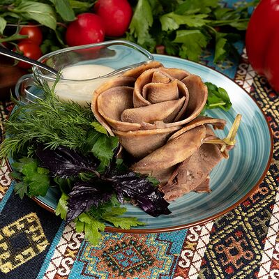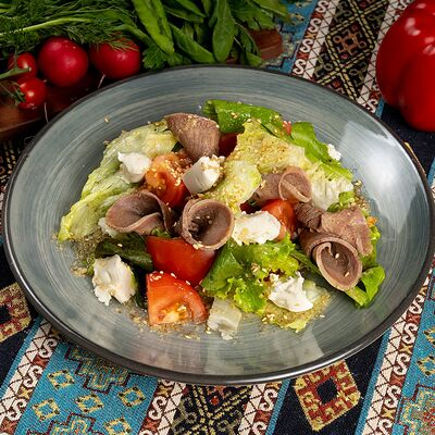Язык говяжий, микс листьев салата, помидор, сыр фета, кунжут, фирменный чесночный соус с грецким орехом