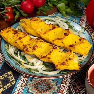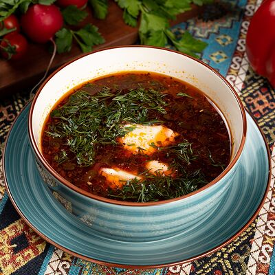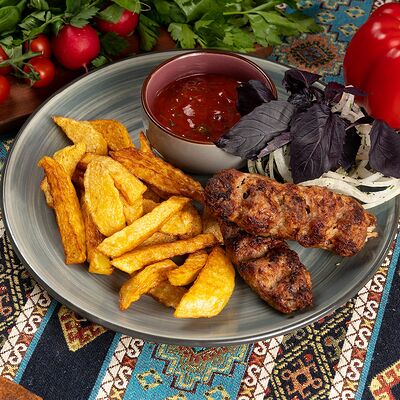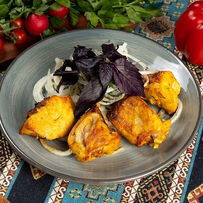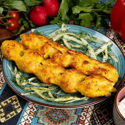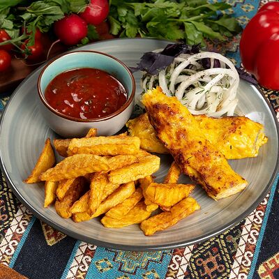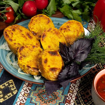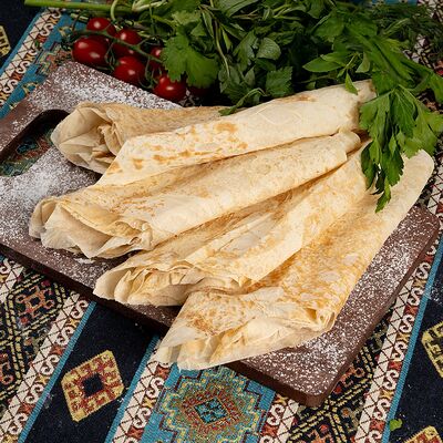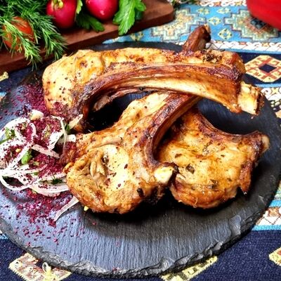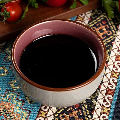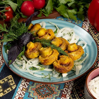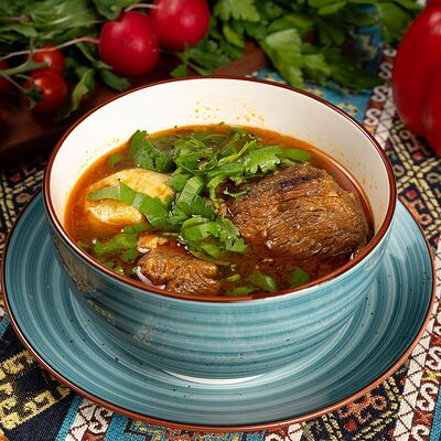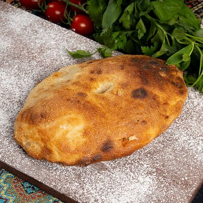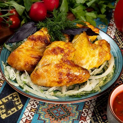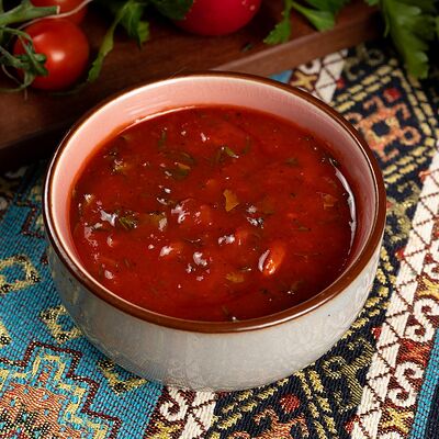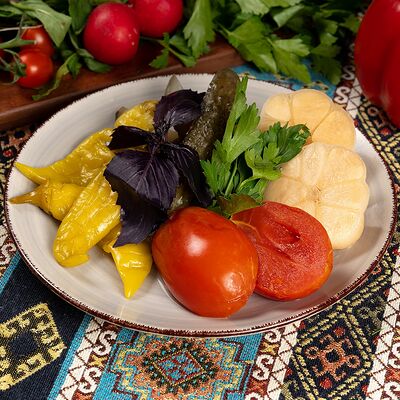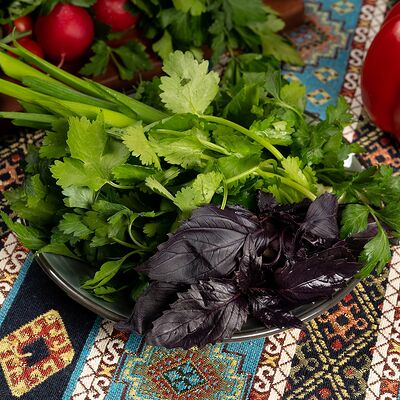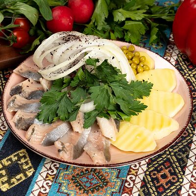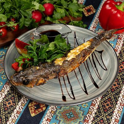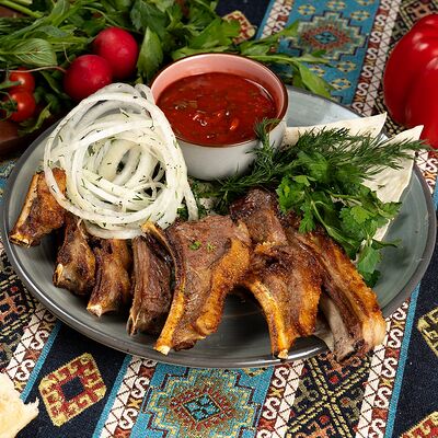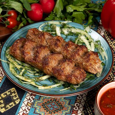 Язык говяжий, микс листьев салата, помидор, сыр фета, кунжут, фирменный чесночный соус с грецким орехом