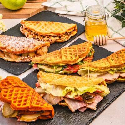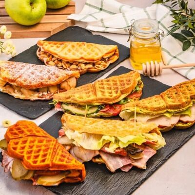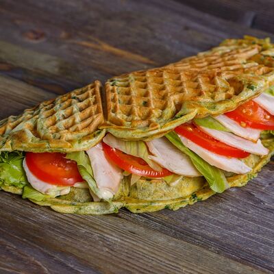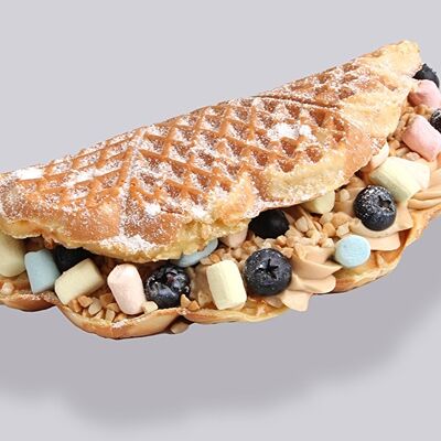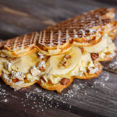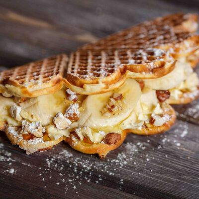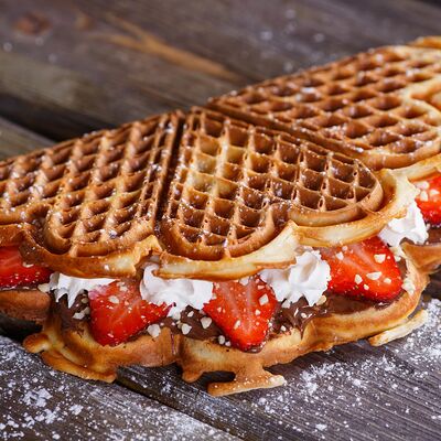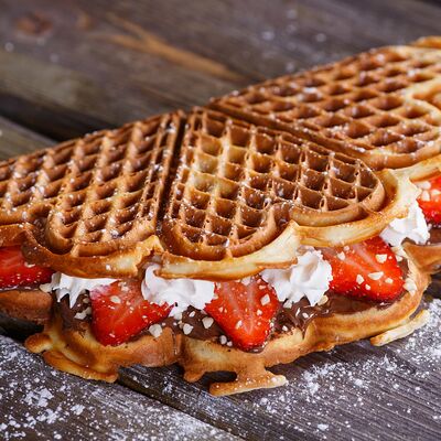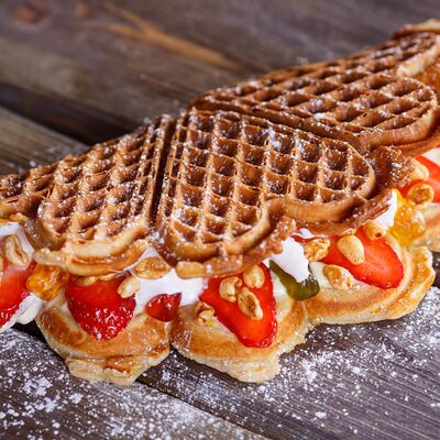 Классическая вафля, клубника в сахарном сиропе, паста ореховая Нутелла, сливки растительные взбитые, арахис, сахарная пудра