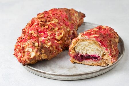 Круассан из слоеного дрожжевого теста с начинкой на основе белого шоколада с вишней, сахарным сиропом, ореховой обмазкой и обсыпкой из вафельной крошки и Круассан из слоеного дрожжевого теста с начинкой на основе белого шоколада с вишней, сахарным сиропом, ореховой обмазкой и обсыпкой из вафельной крошки и лепестков арахиса