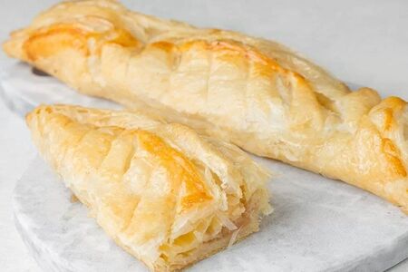 Слойка из бездрожжевого теста с начинкой из грушевого пюре, покрыта абрикосовым гелем