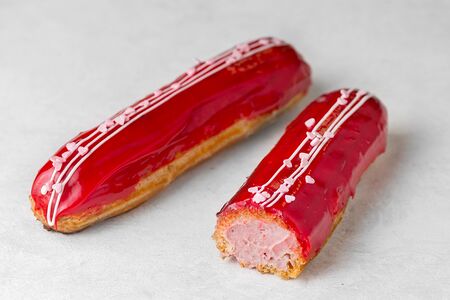 Пирожное из заварного теста с начинкой на основе сливочного крема и клубничного пюре внутри и зеркальной глазурью снаружи