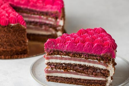 Торт из шоколадных бисквитов, пропитанных малиновым сиропом, с кремом на основе сливочного сыра и слоями малинового желе с белым шоколадом
