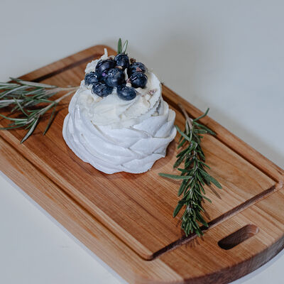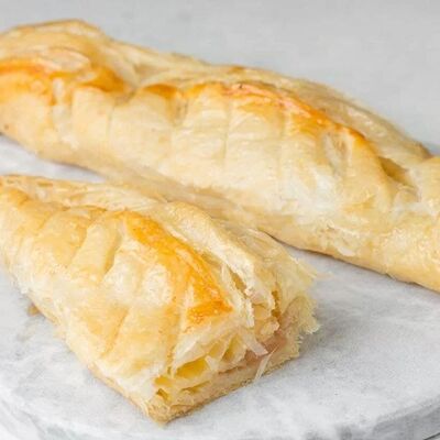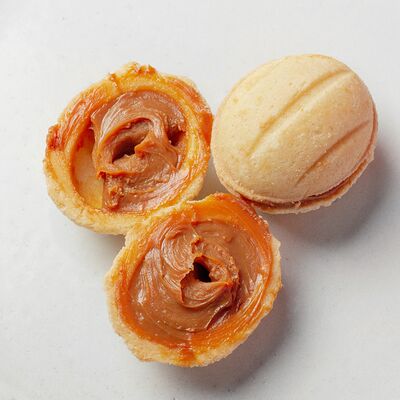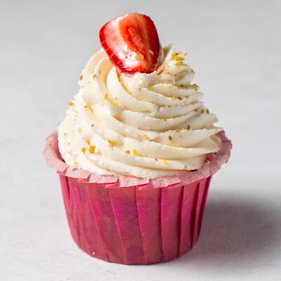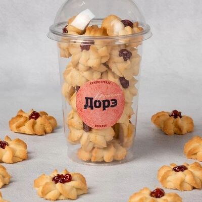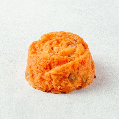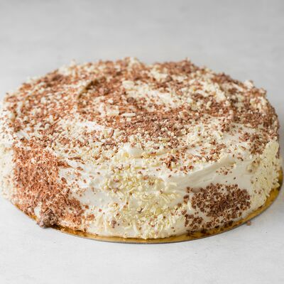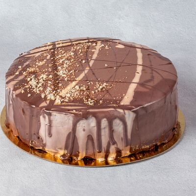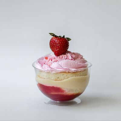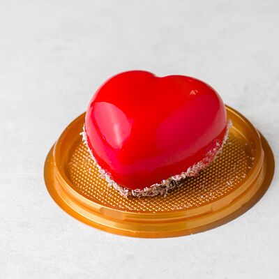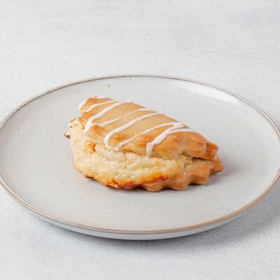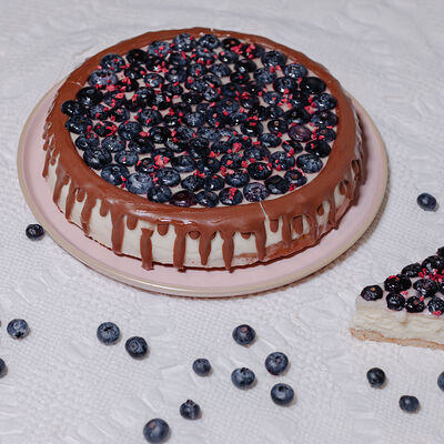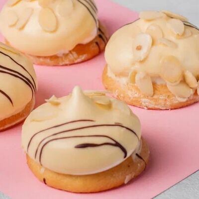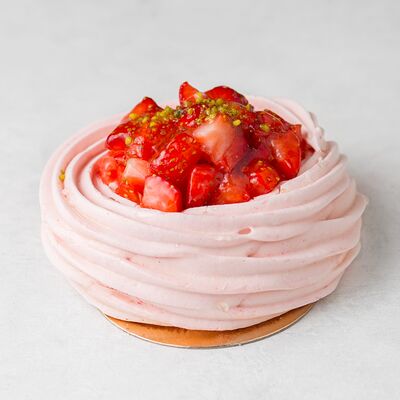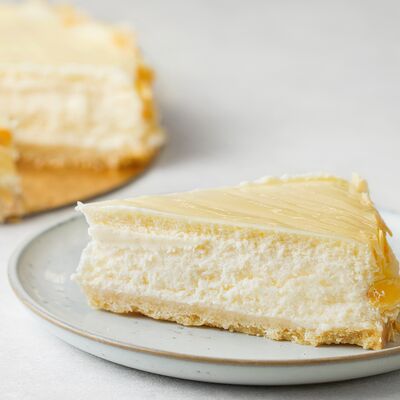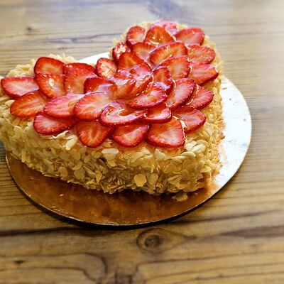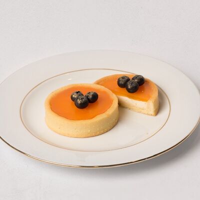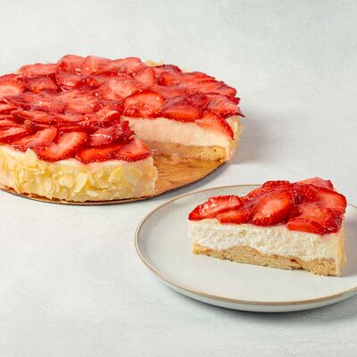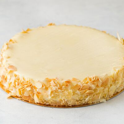 Десерт из сливочного сыра с добавлением сливок, на основе из песочного теста, покрыт абрикосовым гелем и обсыпан лепестками миндаля. Сверху украшен клубникой