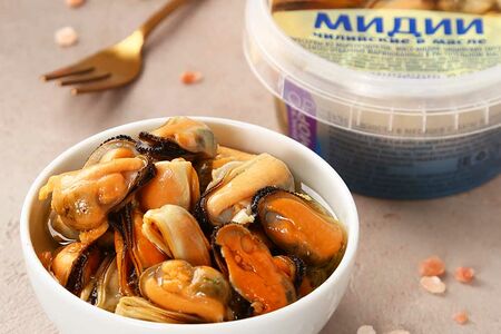 Отварные мидии, маринованные в подсолнечном масле. Мясо мидий очень нежное, в меру солёное, светло-кремового оттенка. Можно использовать в качестве самостоятельной закуски, так и для приготовления праздничных закусок, салатов, пасты.