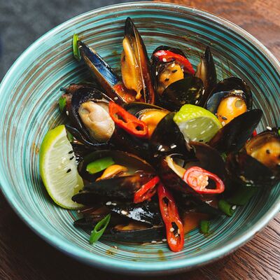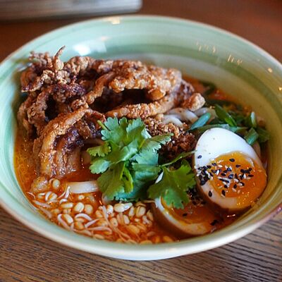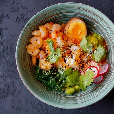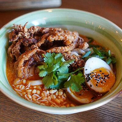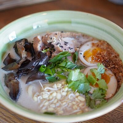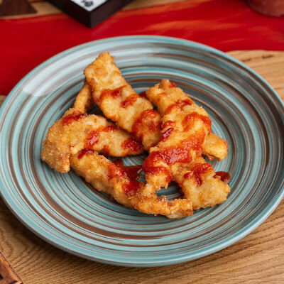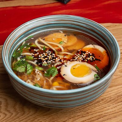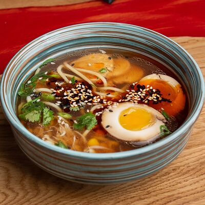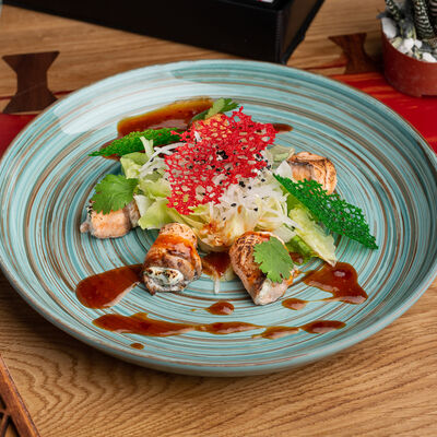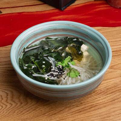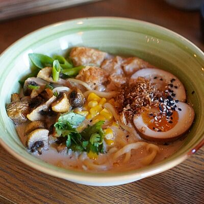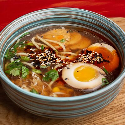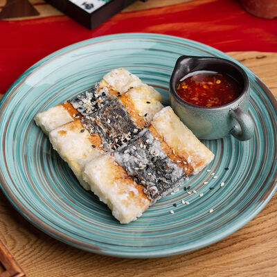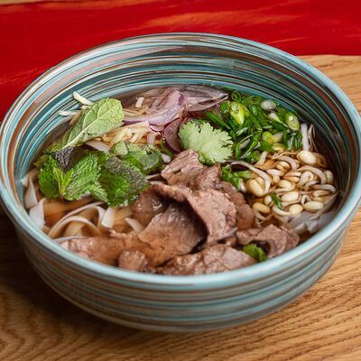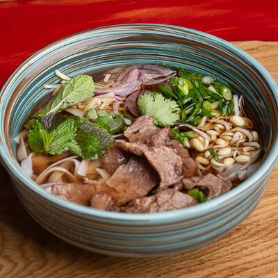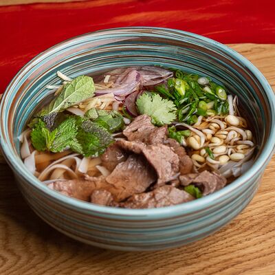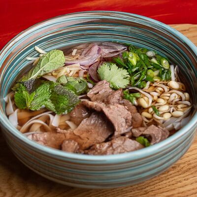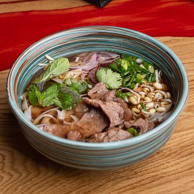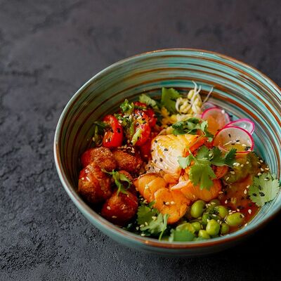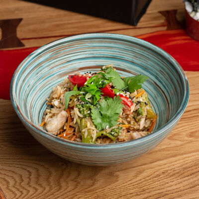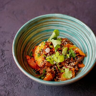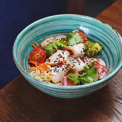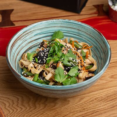 Фунчоза, жареный тофу, грибы муэр, соус сладкий чили, курица су-вид