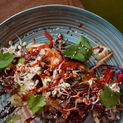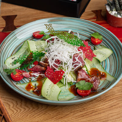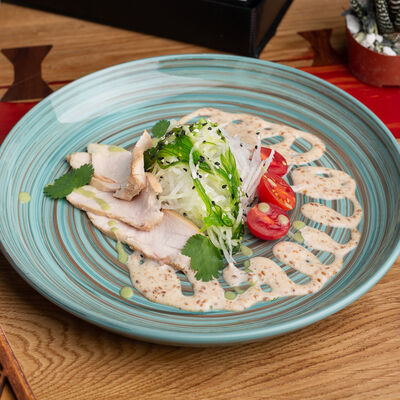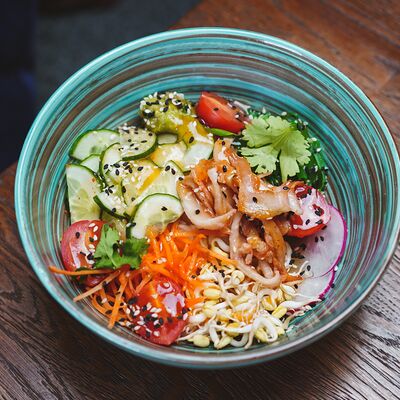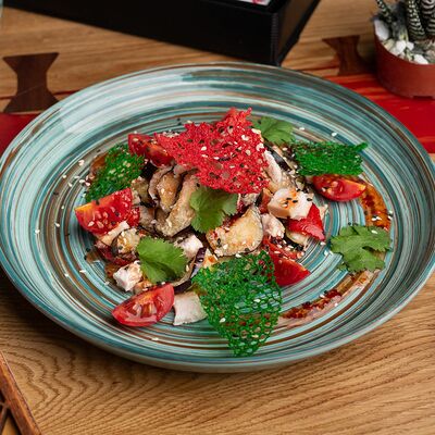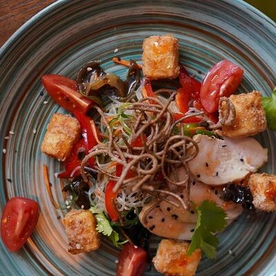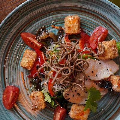Салат из Фунчозы с курицей и жареным сыром тофу доставка