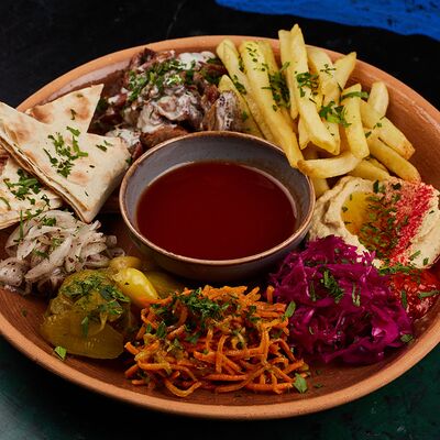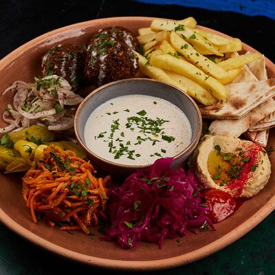Листья салата, желтый фалафель, томленые томаты, морковь свежая, капуста красная маринованная, горчичная заправка