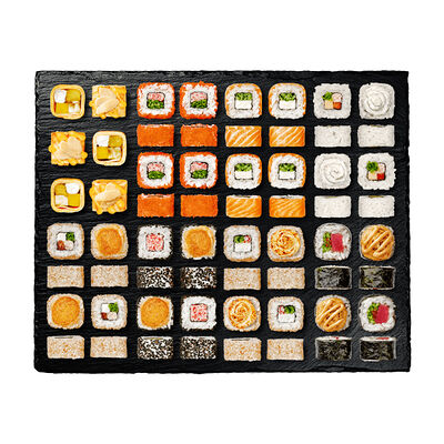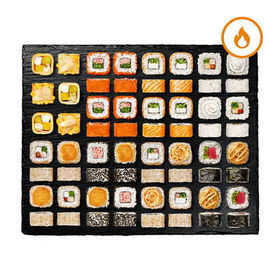 Лосось, масаго красная, сыр сливочный, сыр твёрдый, соус спайси, такуан, лук фри, нори, рис