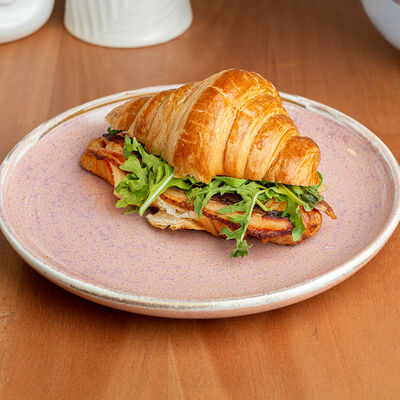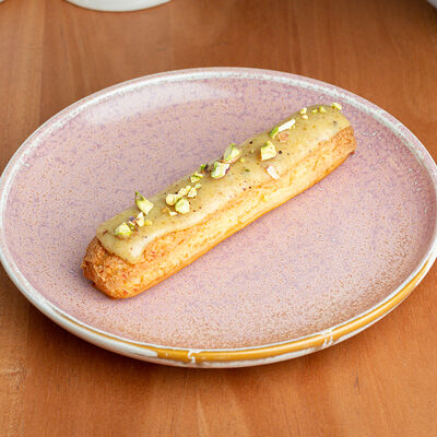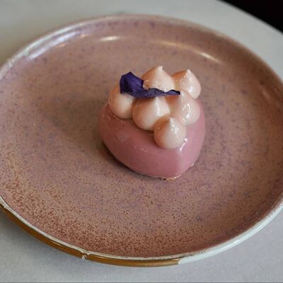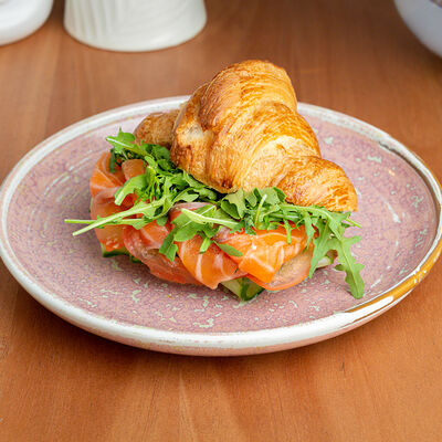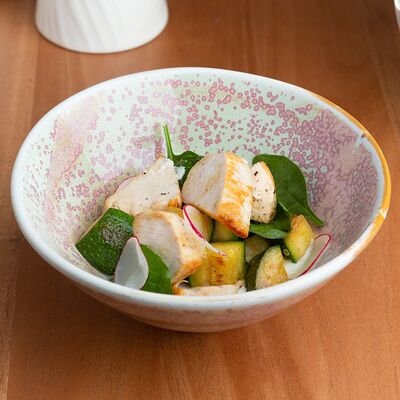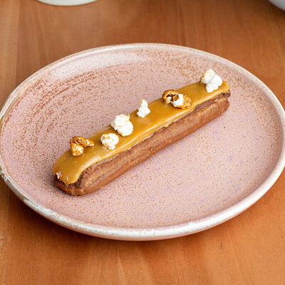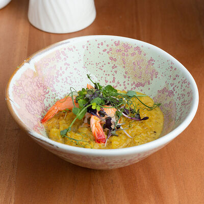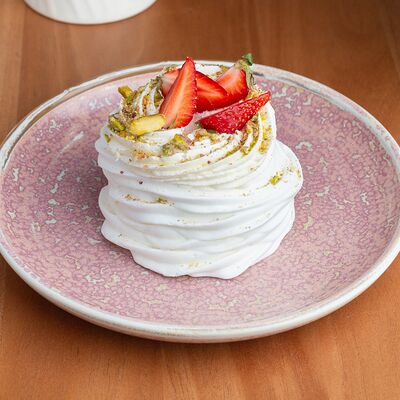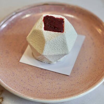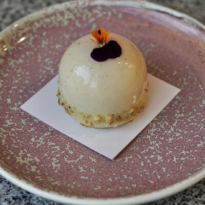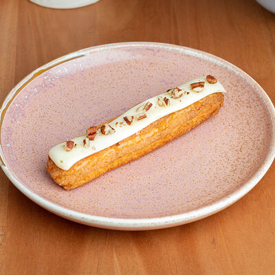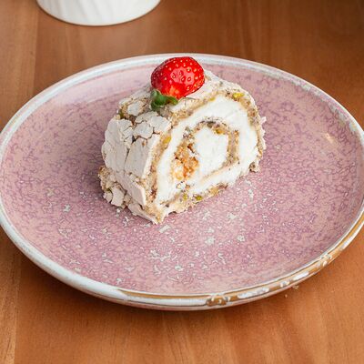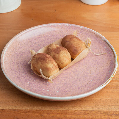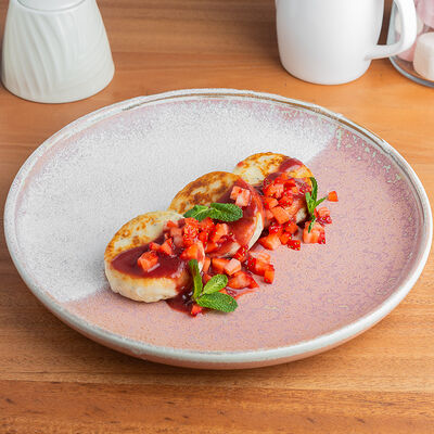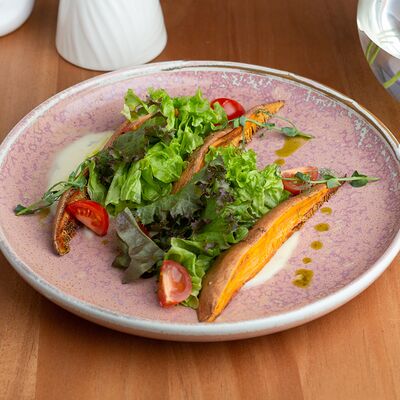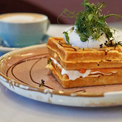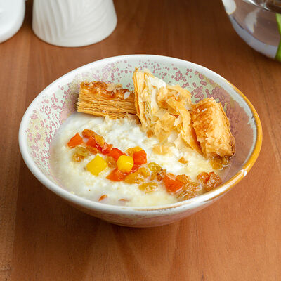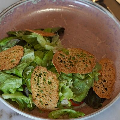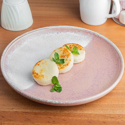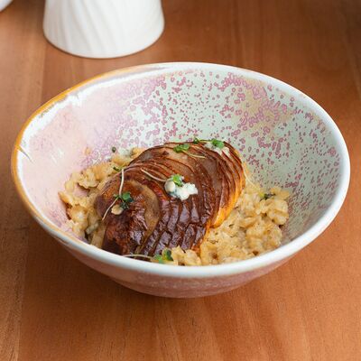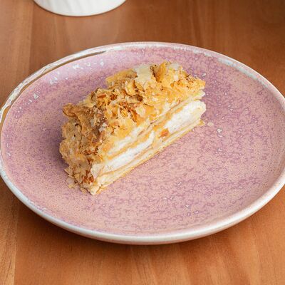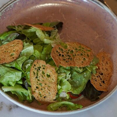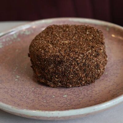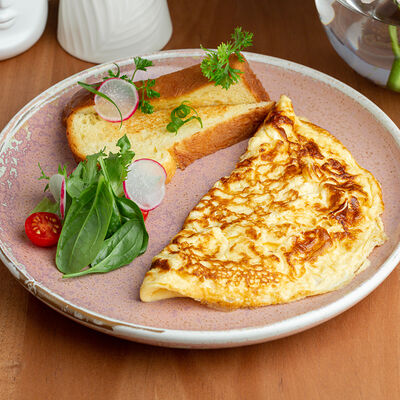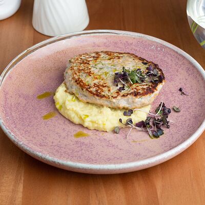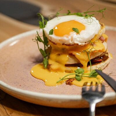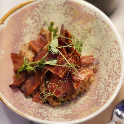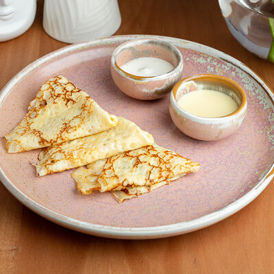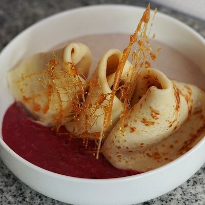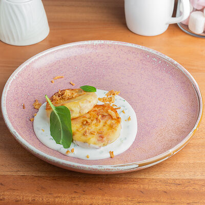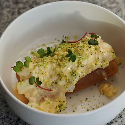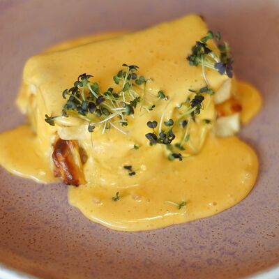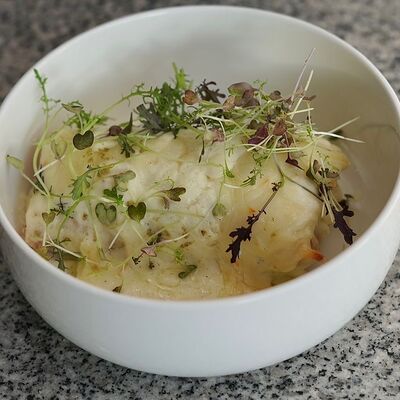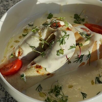 Творог, бекон, пармезан, лук, желток куриный. Под соусом из сметаны с травами
