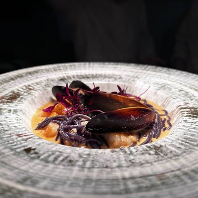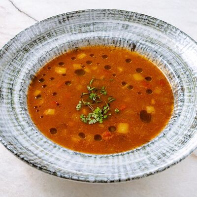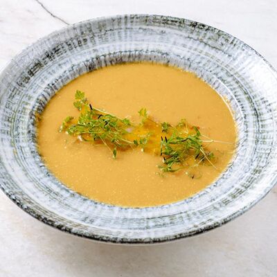 Тыквенный крем-суп с добавлением моркови, лука, сливок, креветок и апельсина