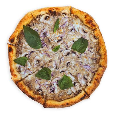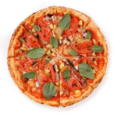 Томатная основа, картошка, огурец, лук, грибы, томаты (25 см). Данную пиццу советуем полить соусом: Барбекю