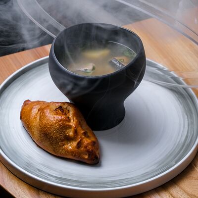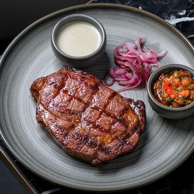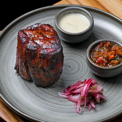 Фарш из мраморной говядины, салат романо, лук красный, помидоры розовые, свежие огурцы, сыр моцарелла, мисо-паста, булочка для бургера, домашний майонез (яйцо куриное, масло растительное, сок лимона, горчица, сахарный песок, соль), соус чили сладкий