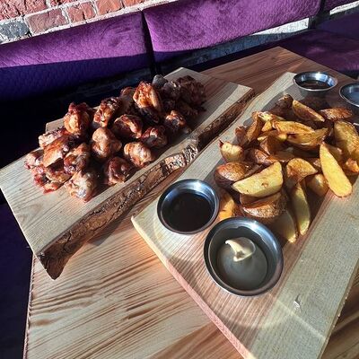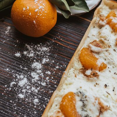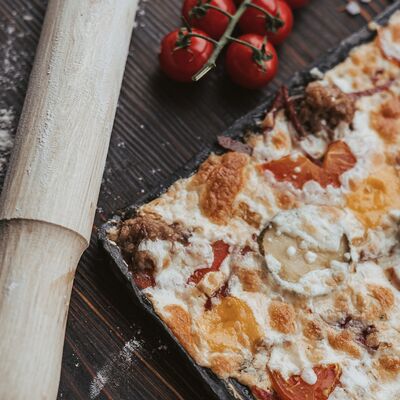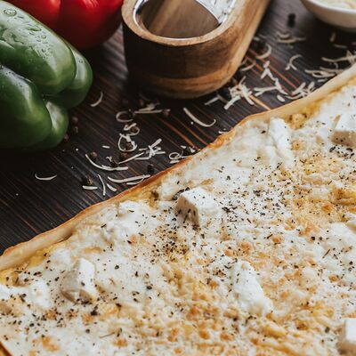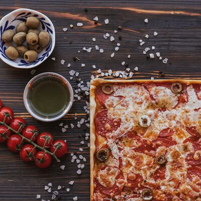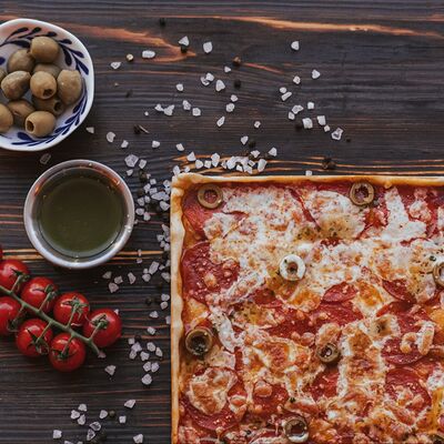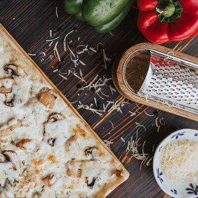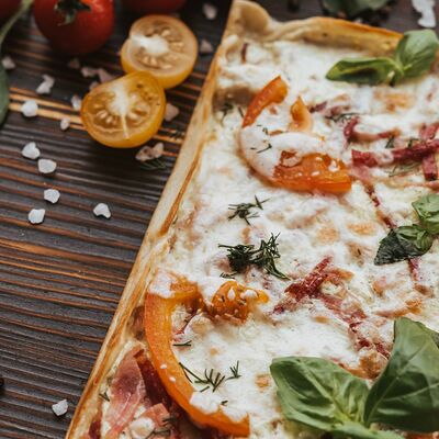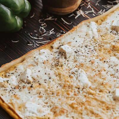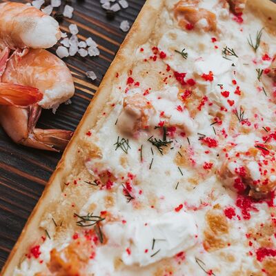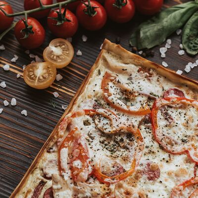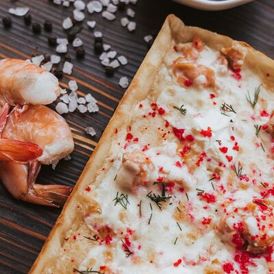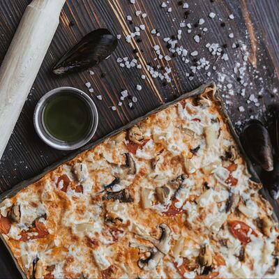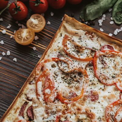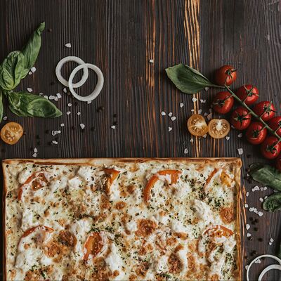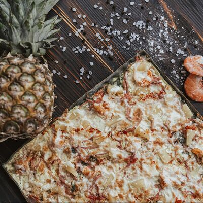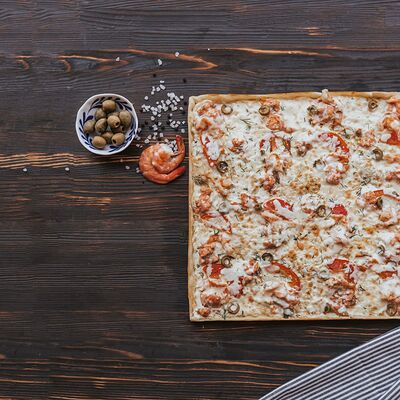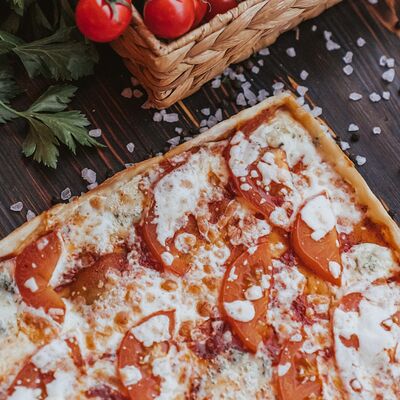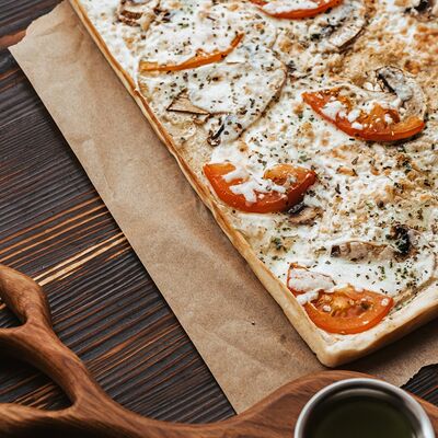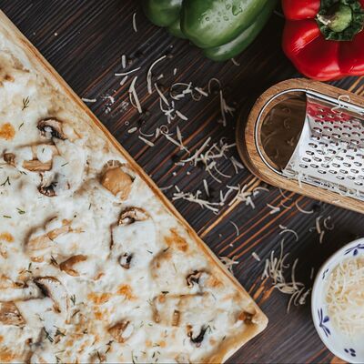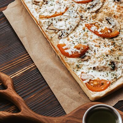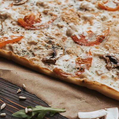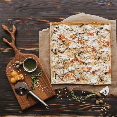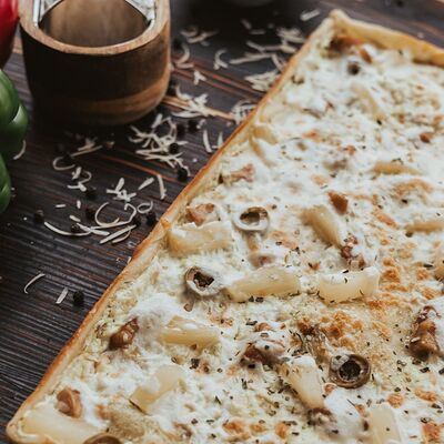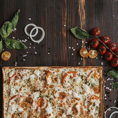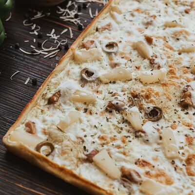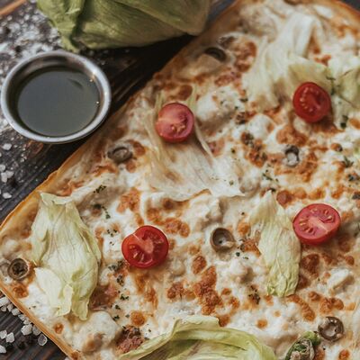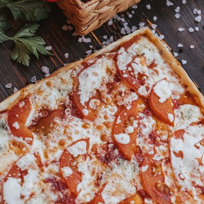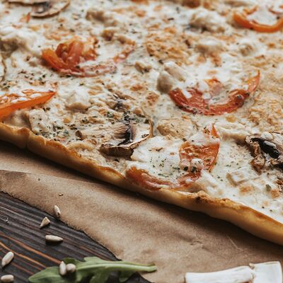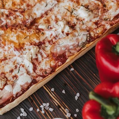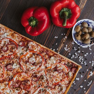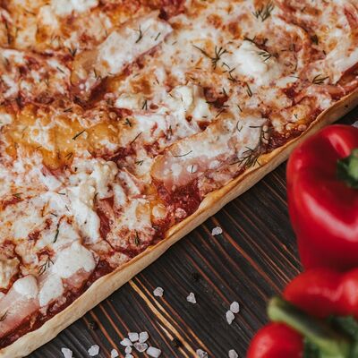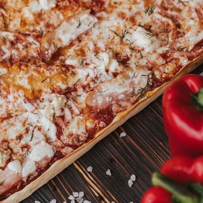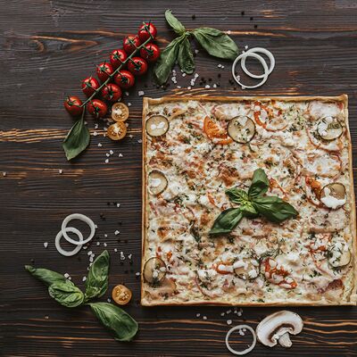 Соус красный, моцарелла, грудинка, ветчина, маринованная курица, лук репчатый, укроп (33 см)