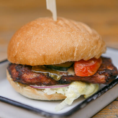 Куриная отбивная на угольном гриле, салат айсберг, томаты свежие, огурец малосольный, лук красный, масло растительное