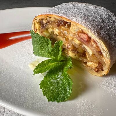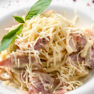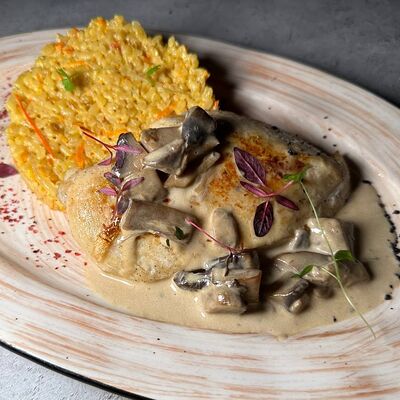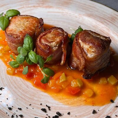Свиная вырезка, запеченная в беконе с овощным соусом на сливках