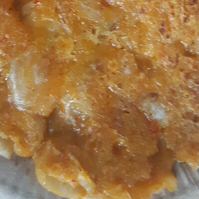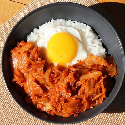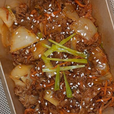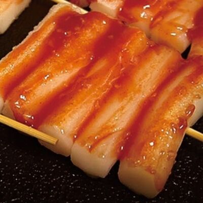 Острые колбаски из рисовой муки с яйцом, капустой, моцареллой, зелёным луком и соусом из красного перца