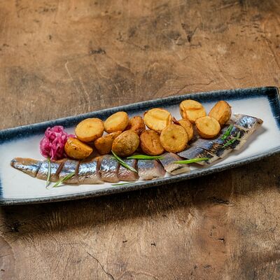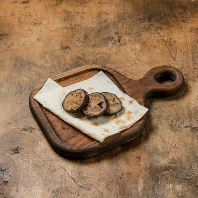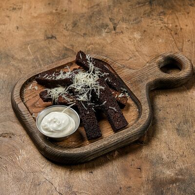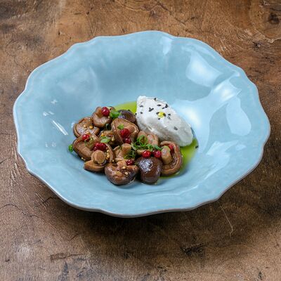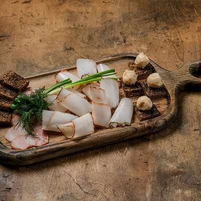 Грузди черные маринованные, масло ароматное, соевый соус, сметана копченая, лук зеленый, брусника моченая, масло зеленое, хлебец с двумя видами семечек