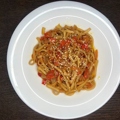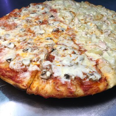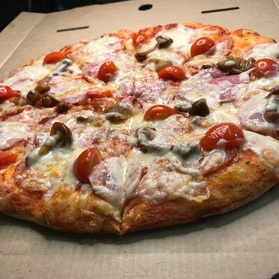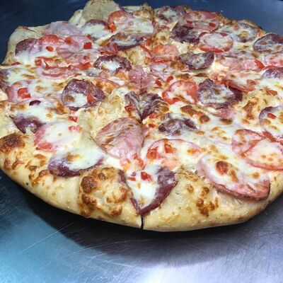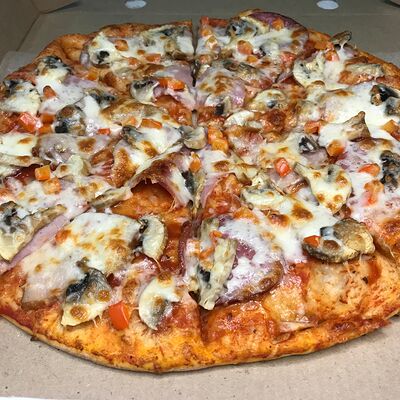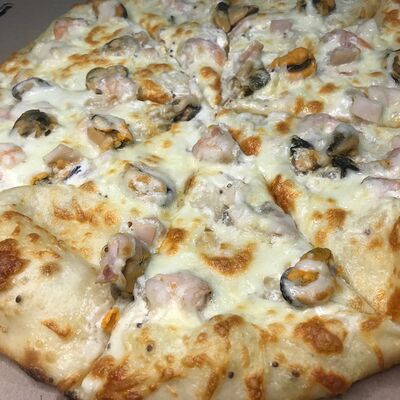 Набор морепродуктов (креветки, кальмары, мидии, лосось), помидоры, сыр моцарелла (33 см)