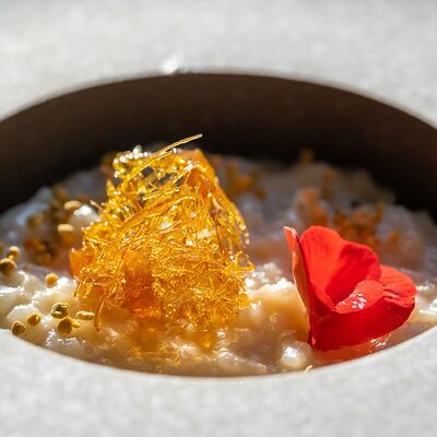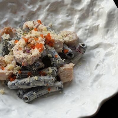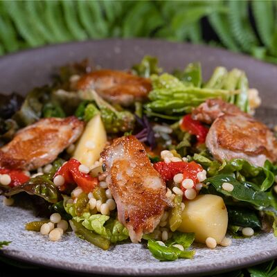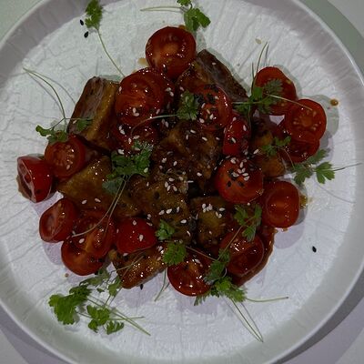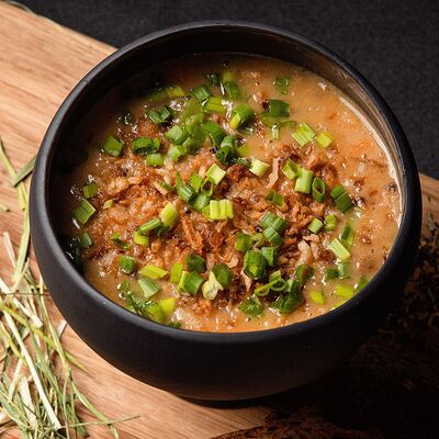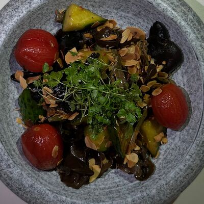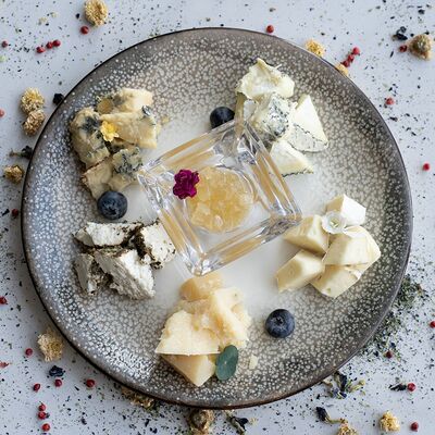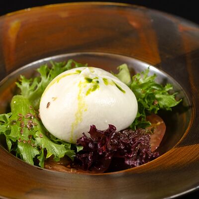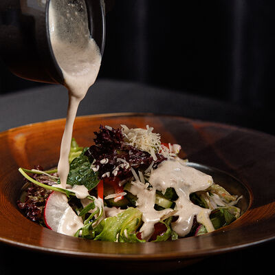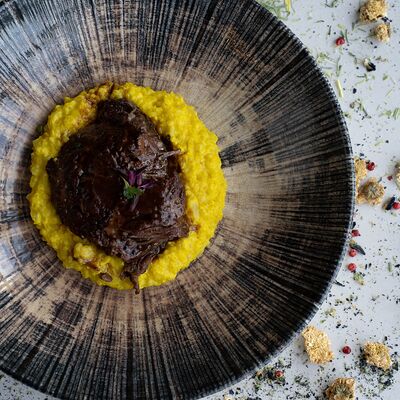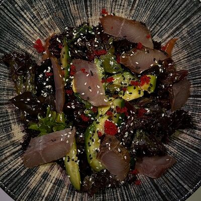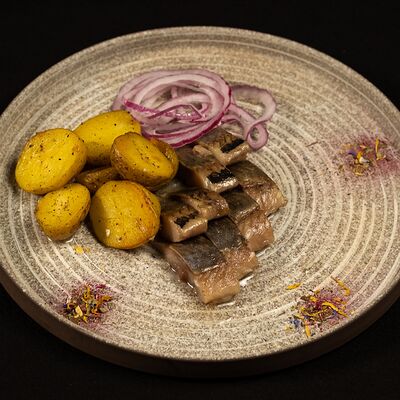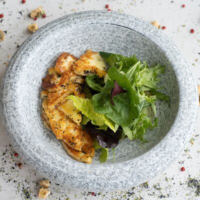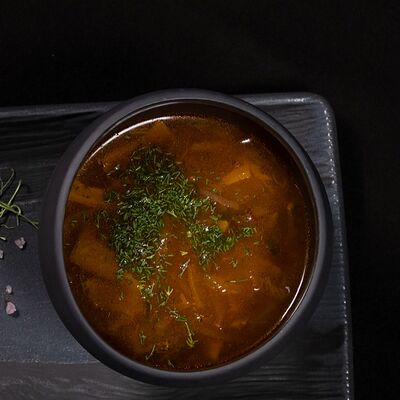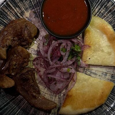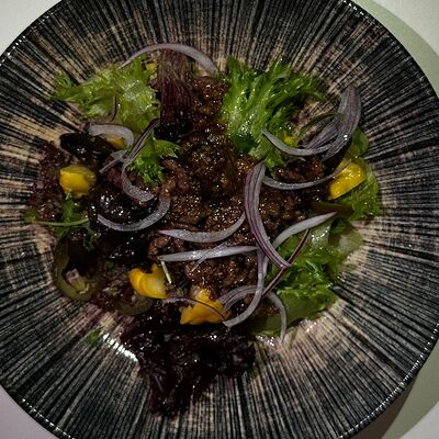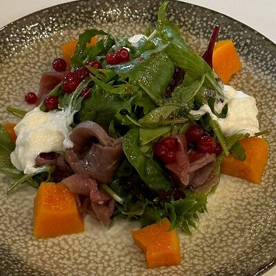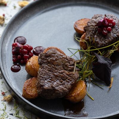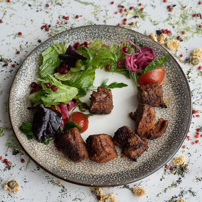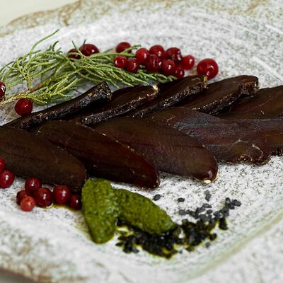 Вяленая косуля, кориандр, зелень, специи, масло оливковое. Подаем с кориандровой аджикой