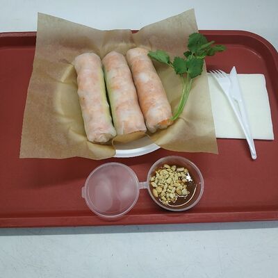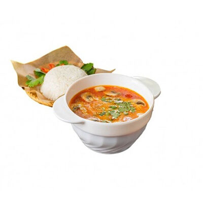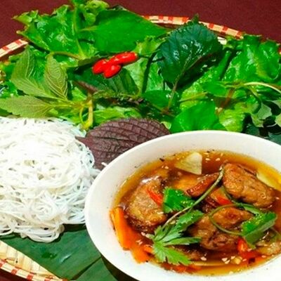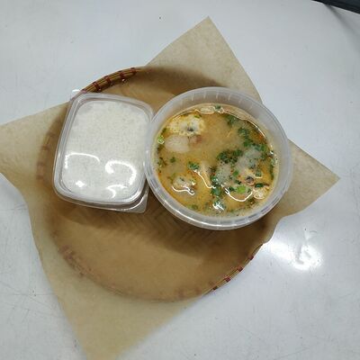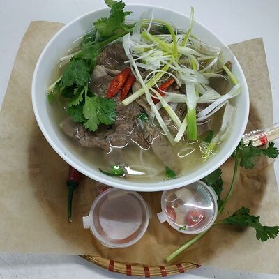 Рисовая лапша, креветки, курица, бульон из говядины, зеленый лук, мята, кинза, ростки сои