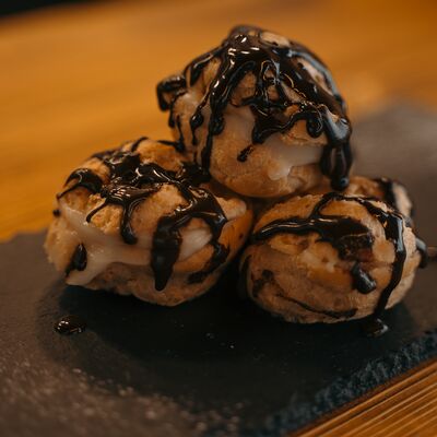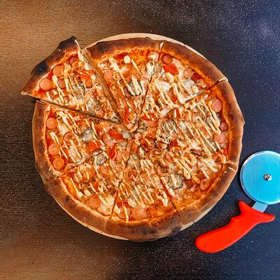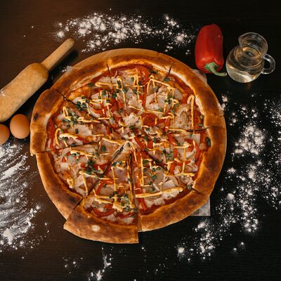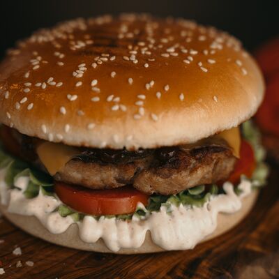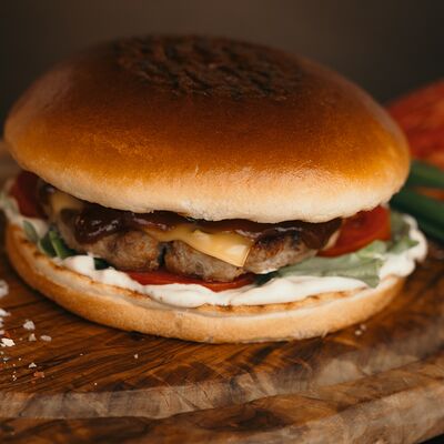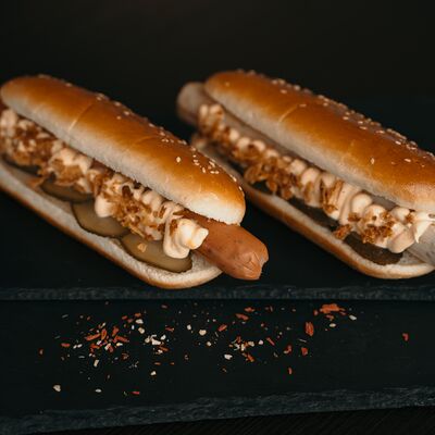 Колбаски гриль из индейки, булочка, огурцы маринованные, лук фри, соус горчичный, соус барбекю и сырный