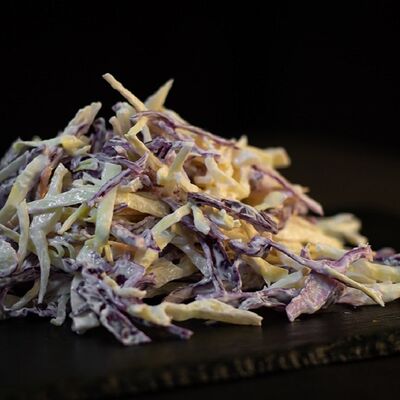 Капуста красная, капуста белая, морковь, сметана, горчица, сахар, соль