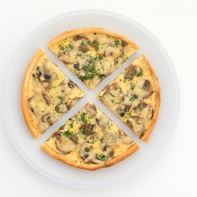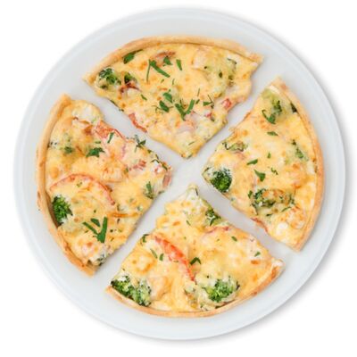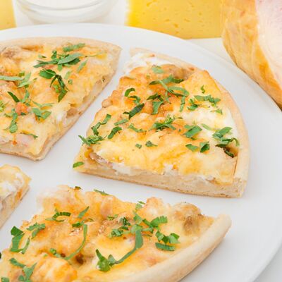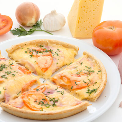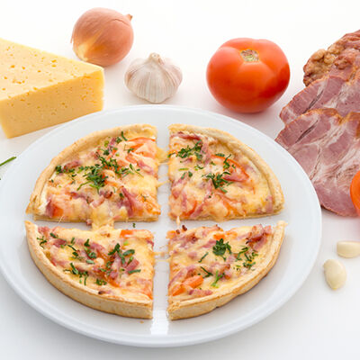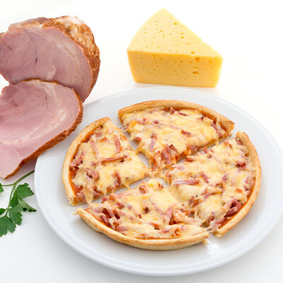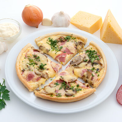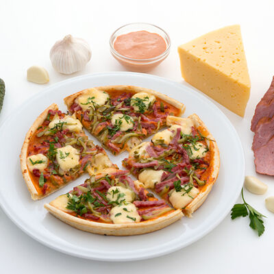 Лук пассерованный, майонез, ветчина, помидоры, сыр, зелень, чеснок гранулированный (22 см)