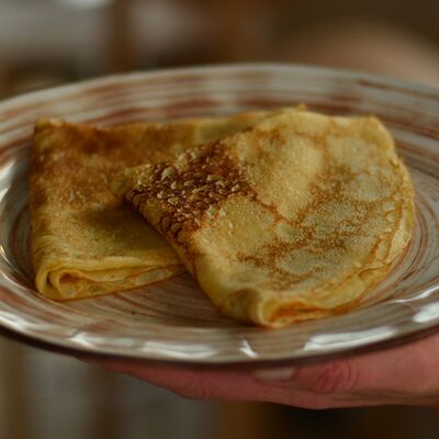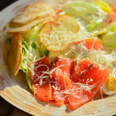Блины (молоко, мука, соль, сахар, яйцо), лосось, сливочный крем и упаковка для блюда