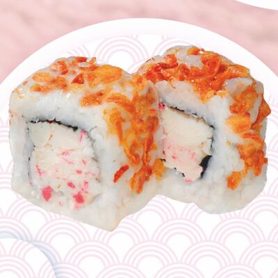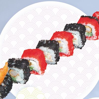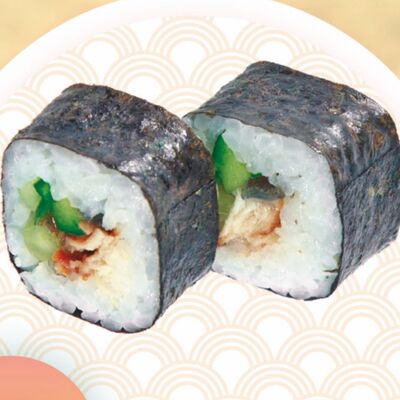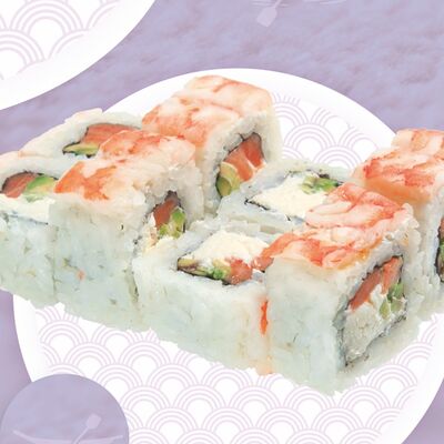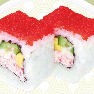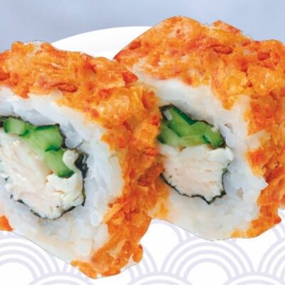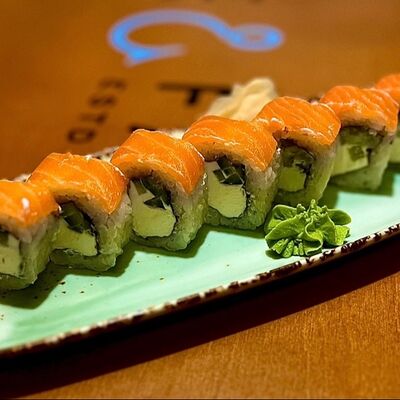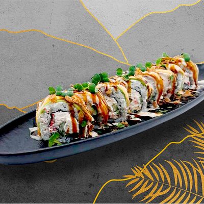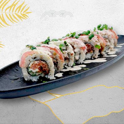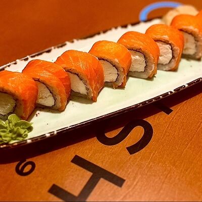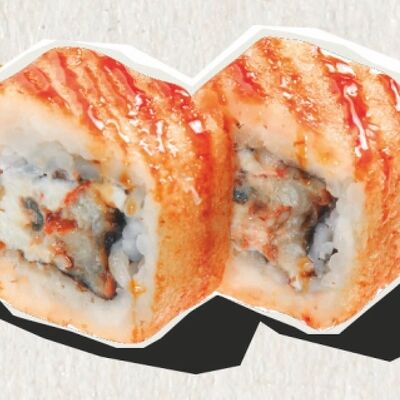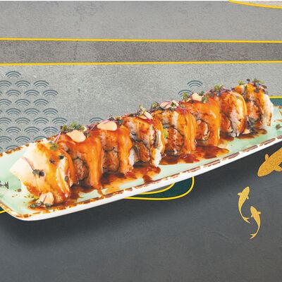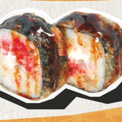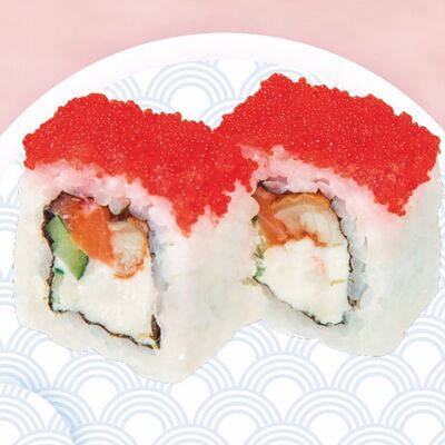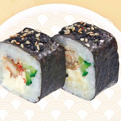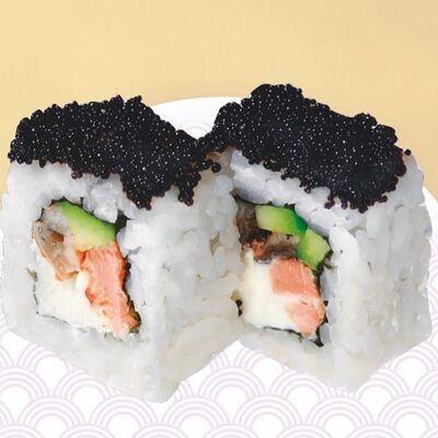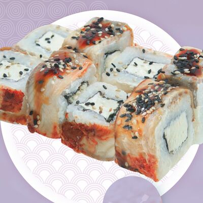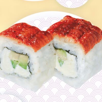 Жареный угорь, сливочный сыр, лосось, огурец, икра тобико, рис, нори