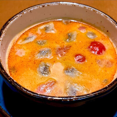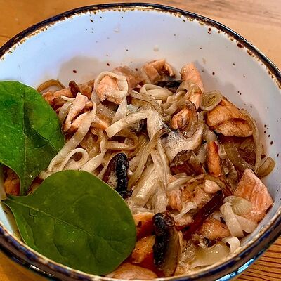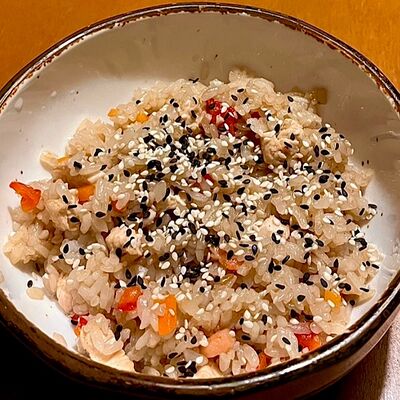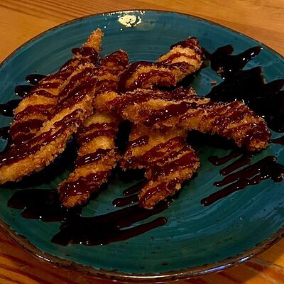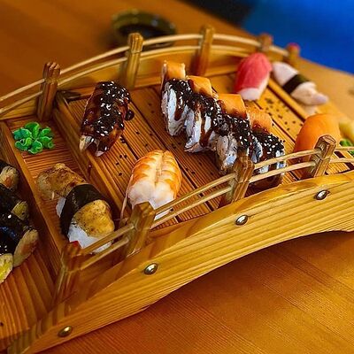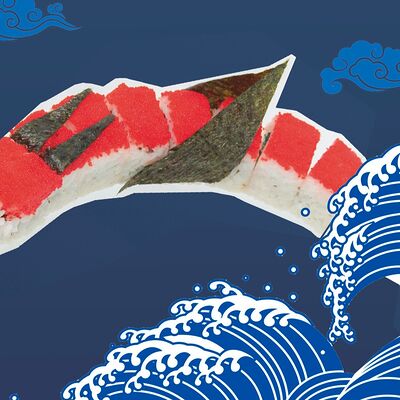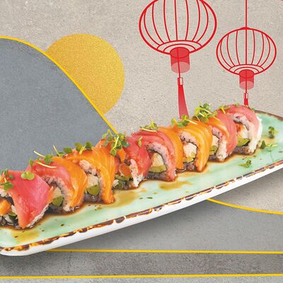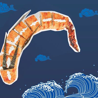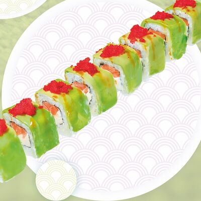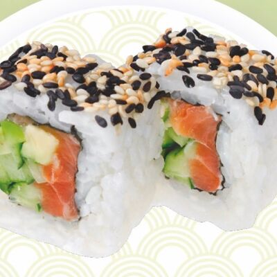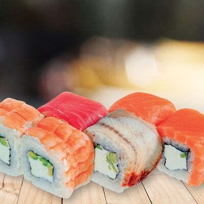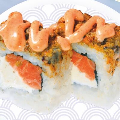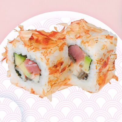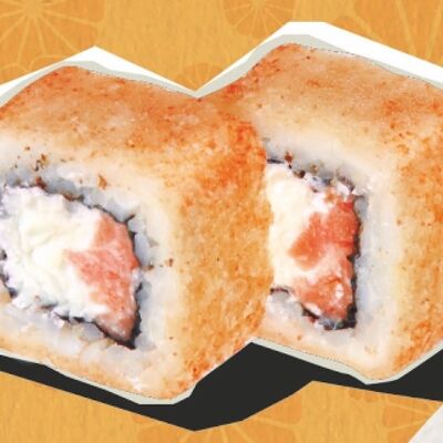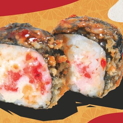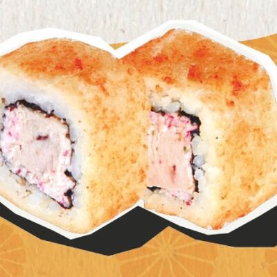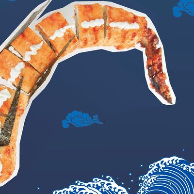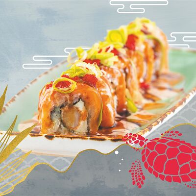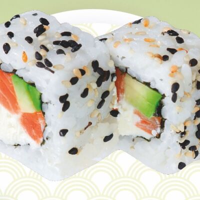 Жареный угорь, сливочный сыр, лосось, огурец, икра тобико, рис, нори