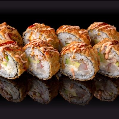 Рис, нори, сыр, огурец, лосось, чеснок, сырный соус