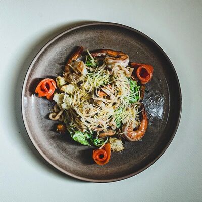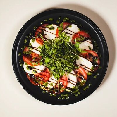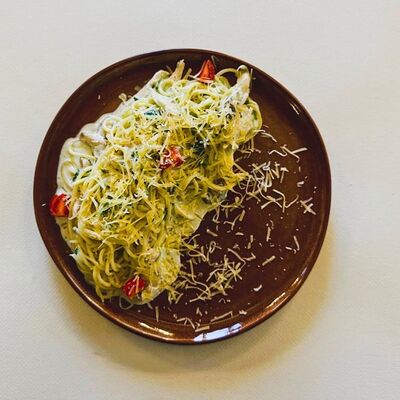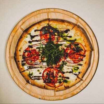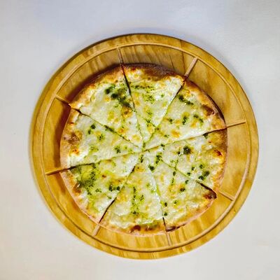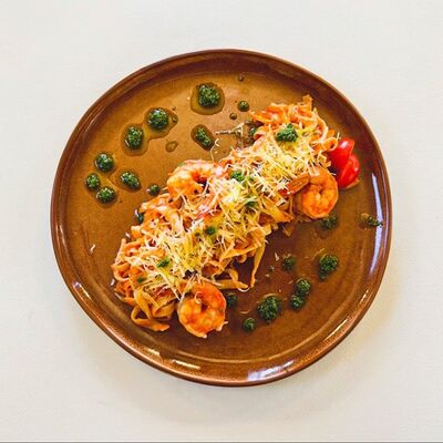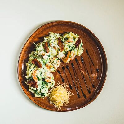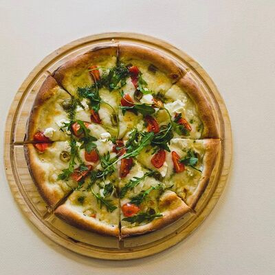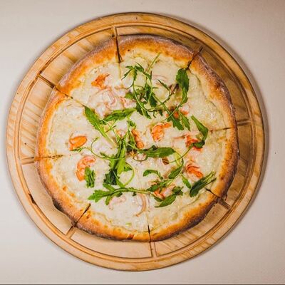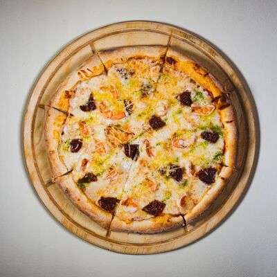 Моцарелла, креветки тигровые, пармезан, вяленые томаты, соус красный для пиццы, зеленое масло