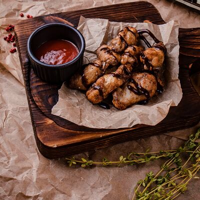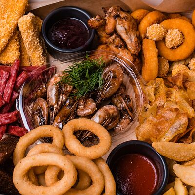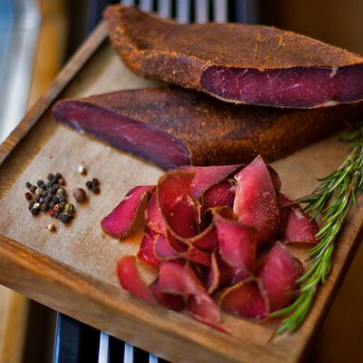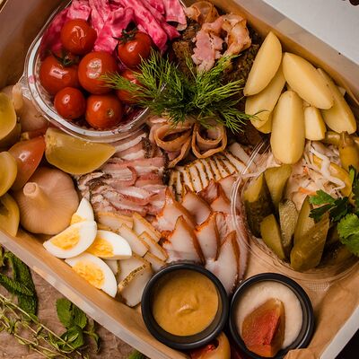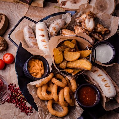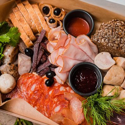 Суджук, бастурма, бекон, карпаччо, колбаса салями, колбаски куриные, колбаски cвинo-говяжьи, вяленое куриное филе, чиабатта, бородинский хлеб, бургер соус, соус барбекю, оливки