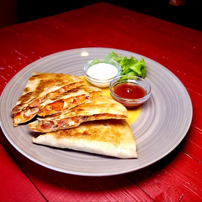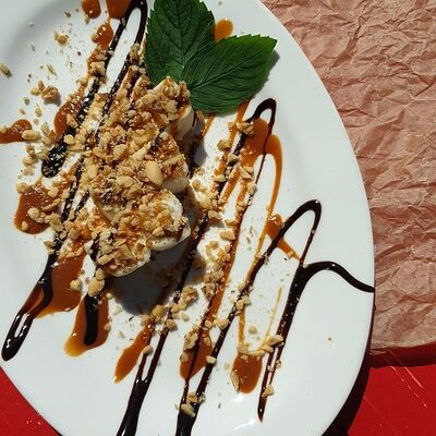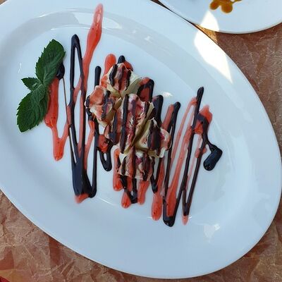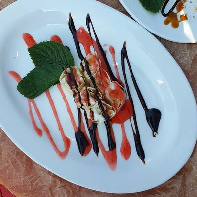 Тесто харумаки, сливочный сыр, ананас консервированный, киви, банан, топпинг шоколадный, клубника, мята