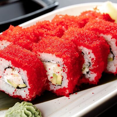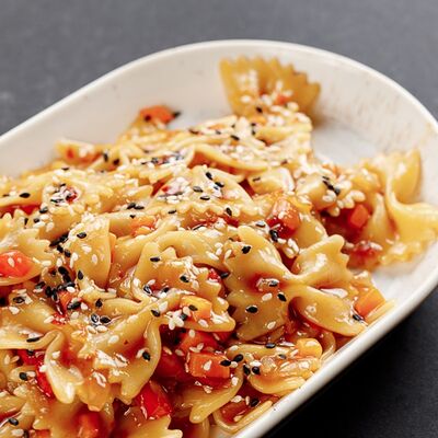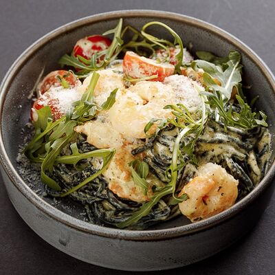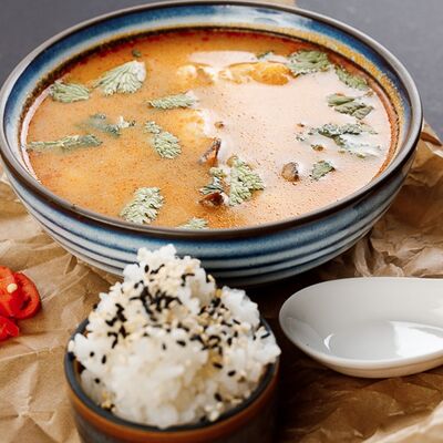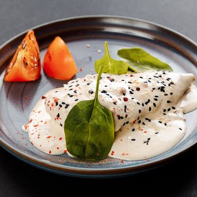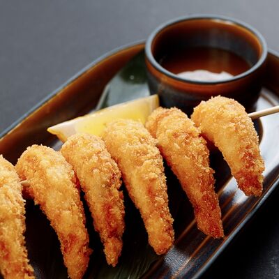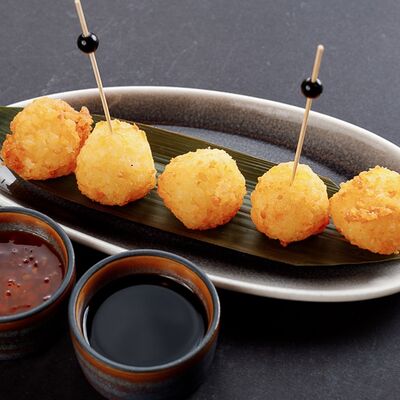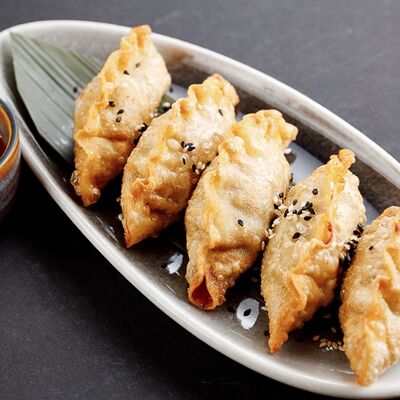 Японские пельмешки с креветкой, свининой и овощами. Подаются с соусом сладкий чили