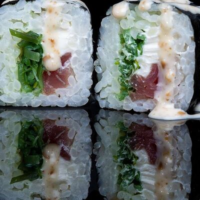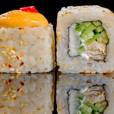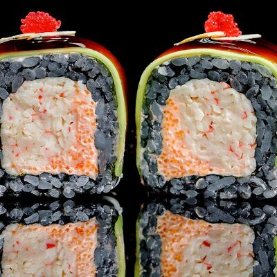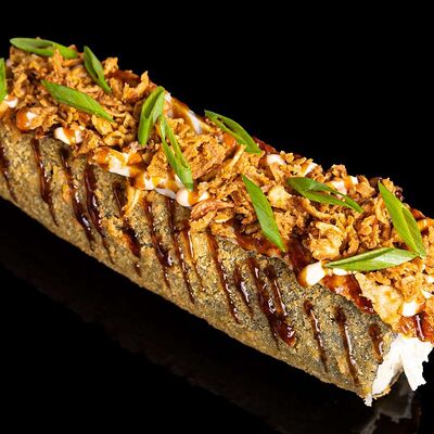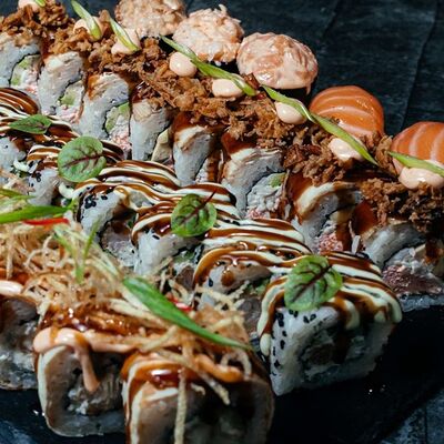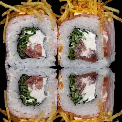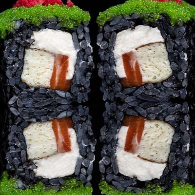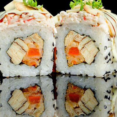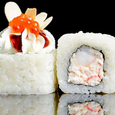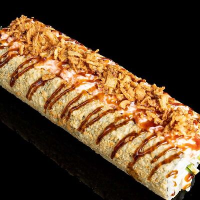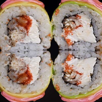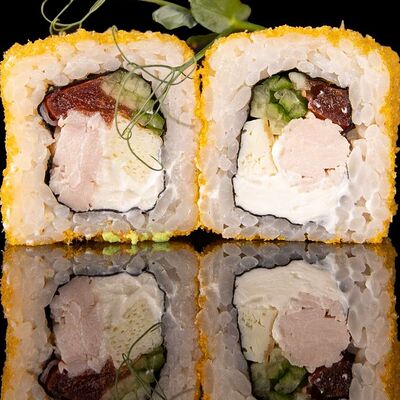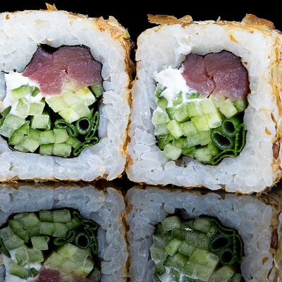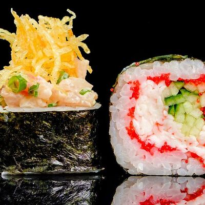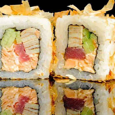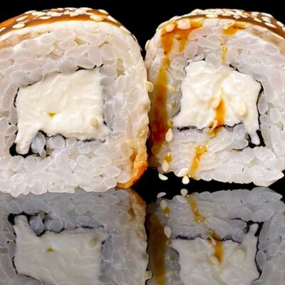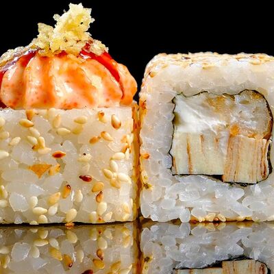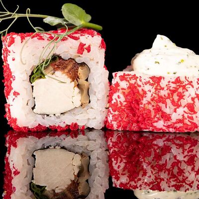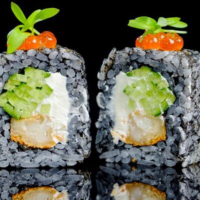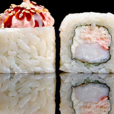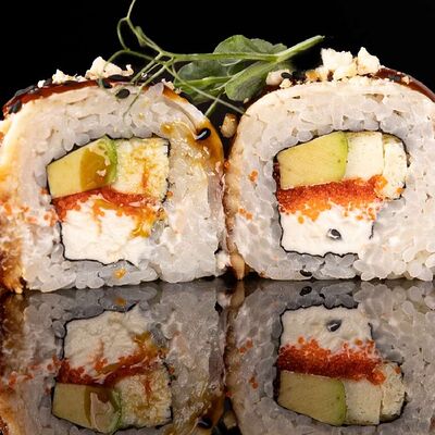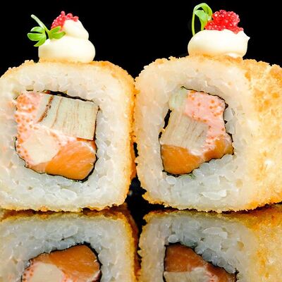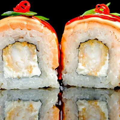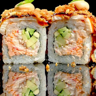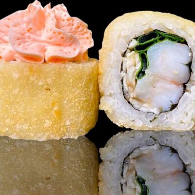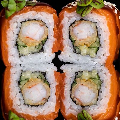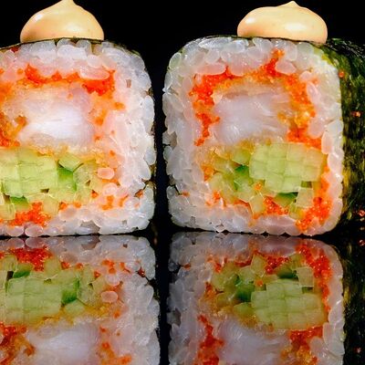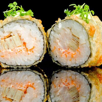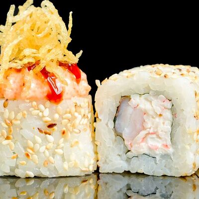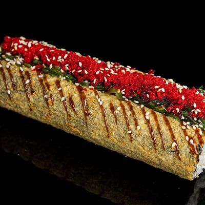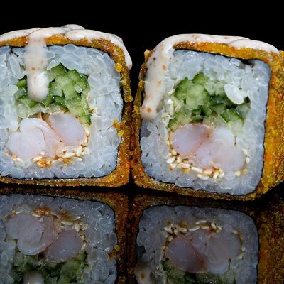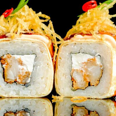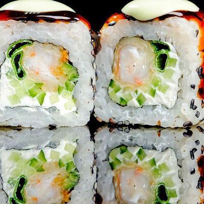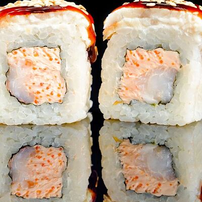 Рис, нори, креветка в темпурном кляре, соус спайси, водоросли чука, соус унаги, икра тобико, сыр сливочный, кунжут