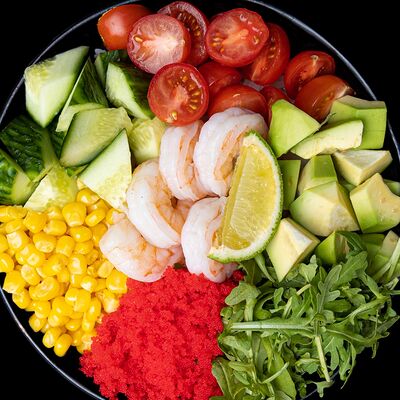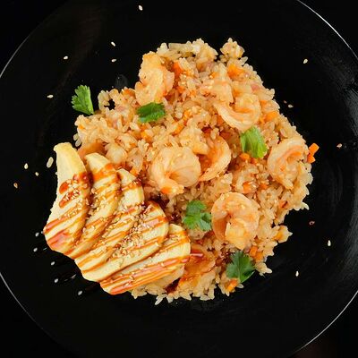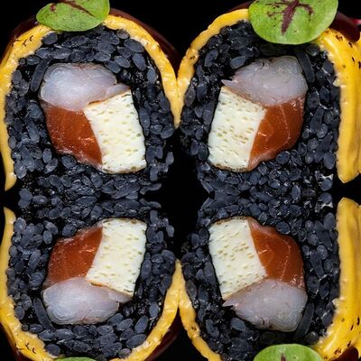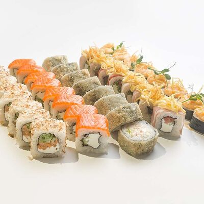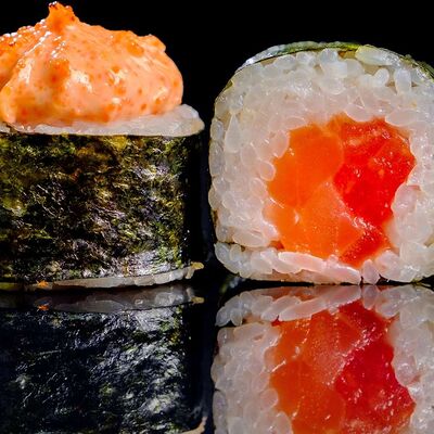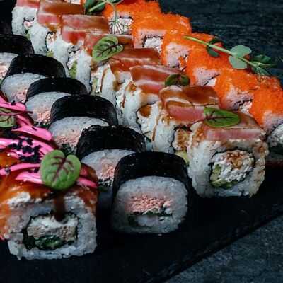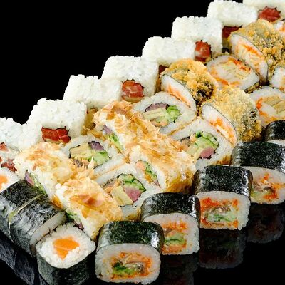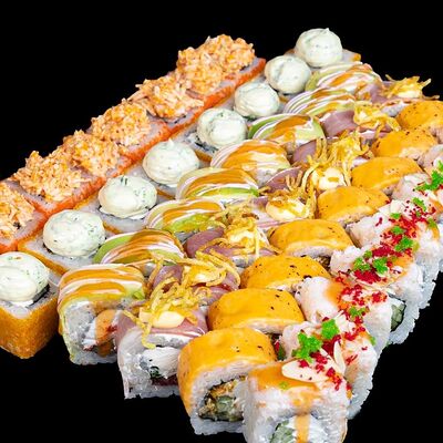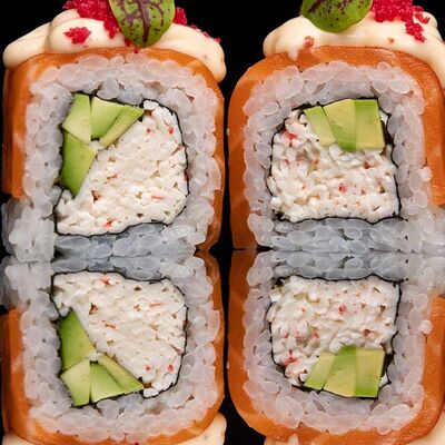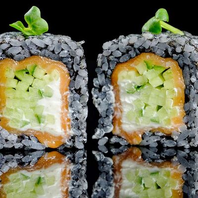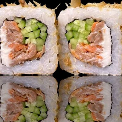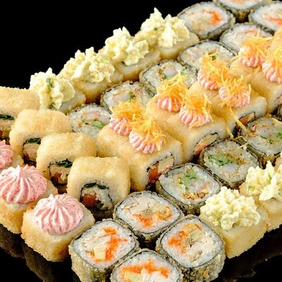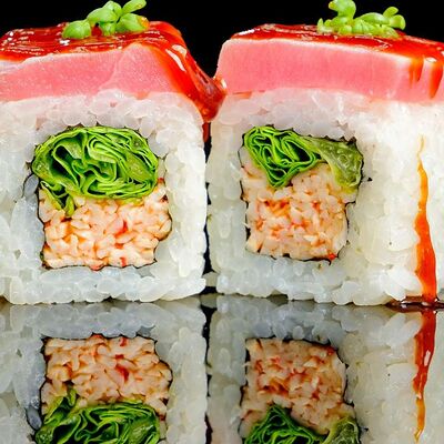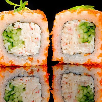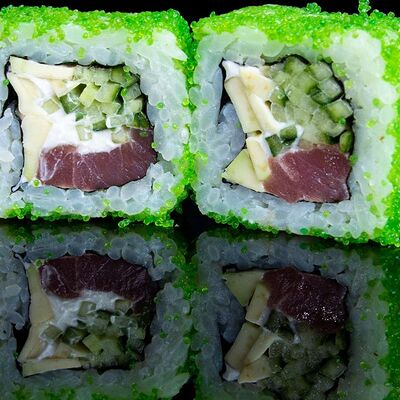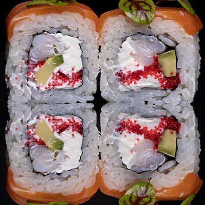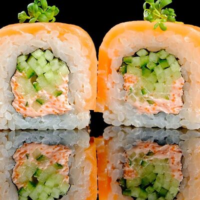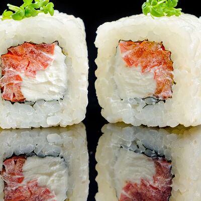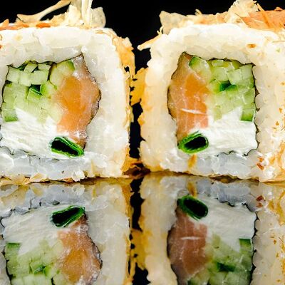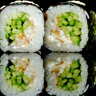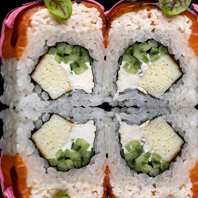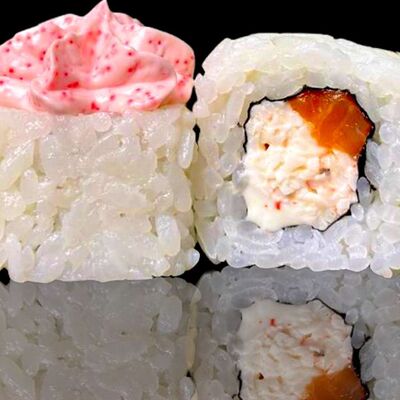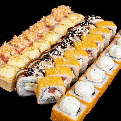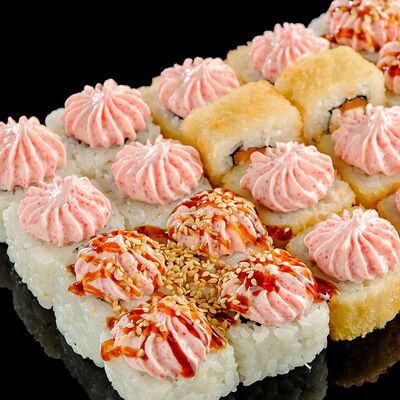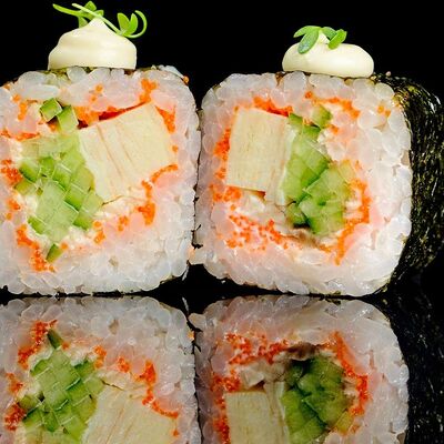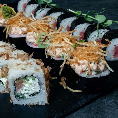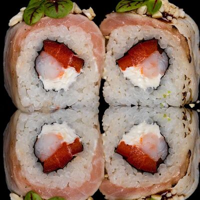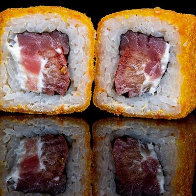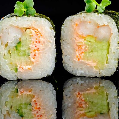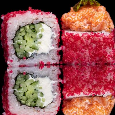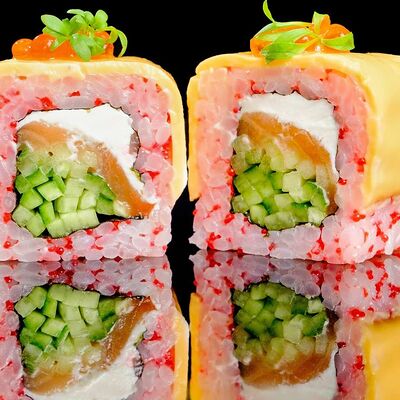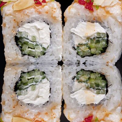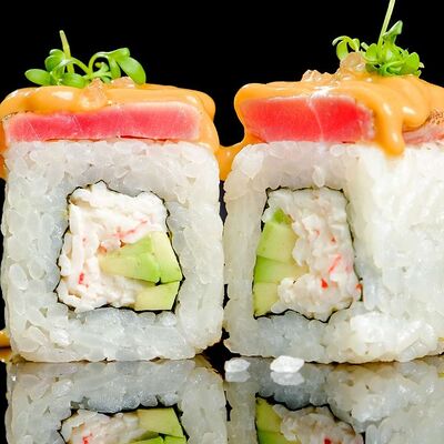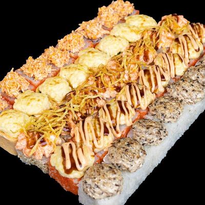 Рис, нори, креветка в темпурном кляре, соус спайси, водоросли чука, соус унаги, икра тобико, сыр сливочный, кунжут