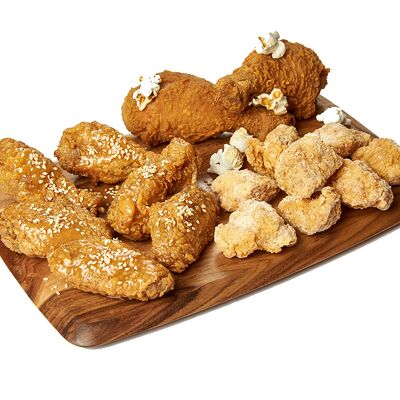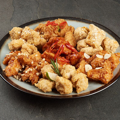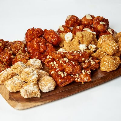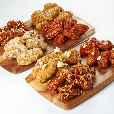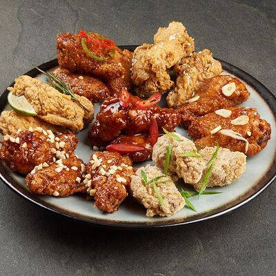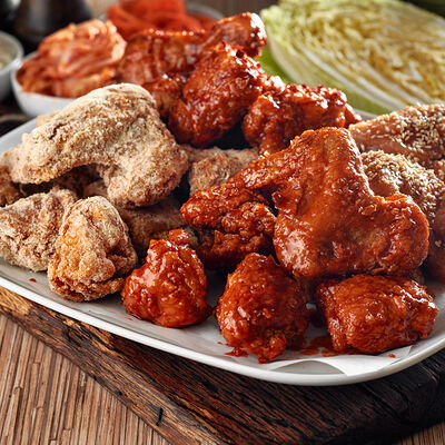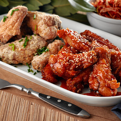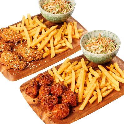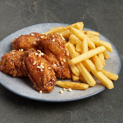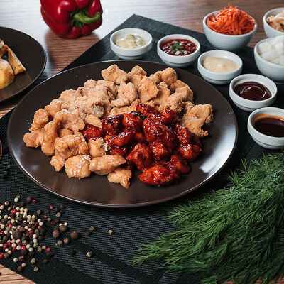 Куриные крылья в хрустящей панировке в двух вкусах на выбор: фрайд, каннам, чили, барбекю, медовый, медово-чесночный или сырный снег
